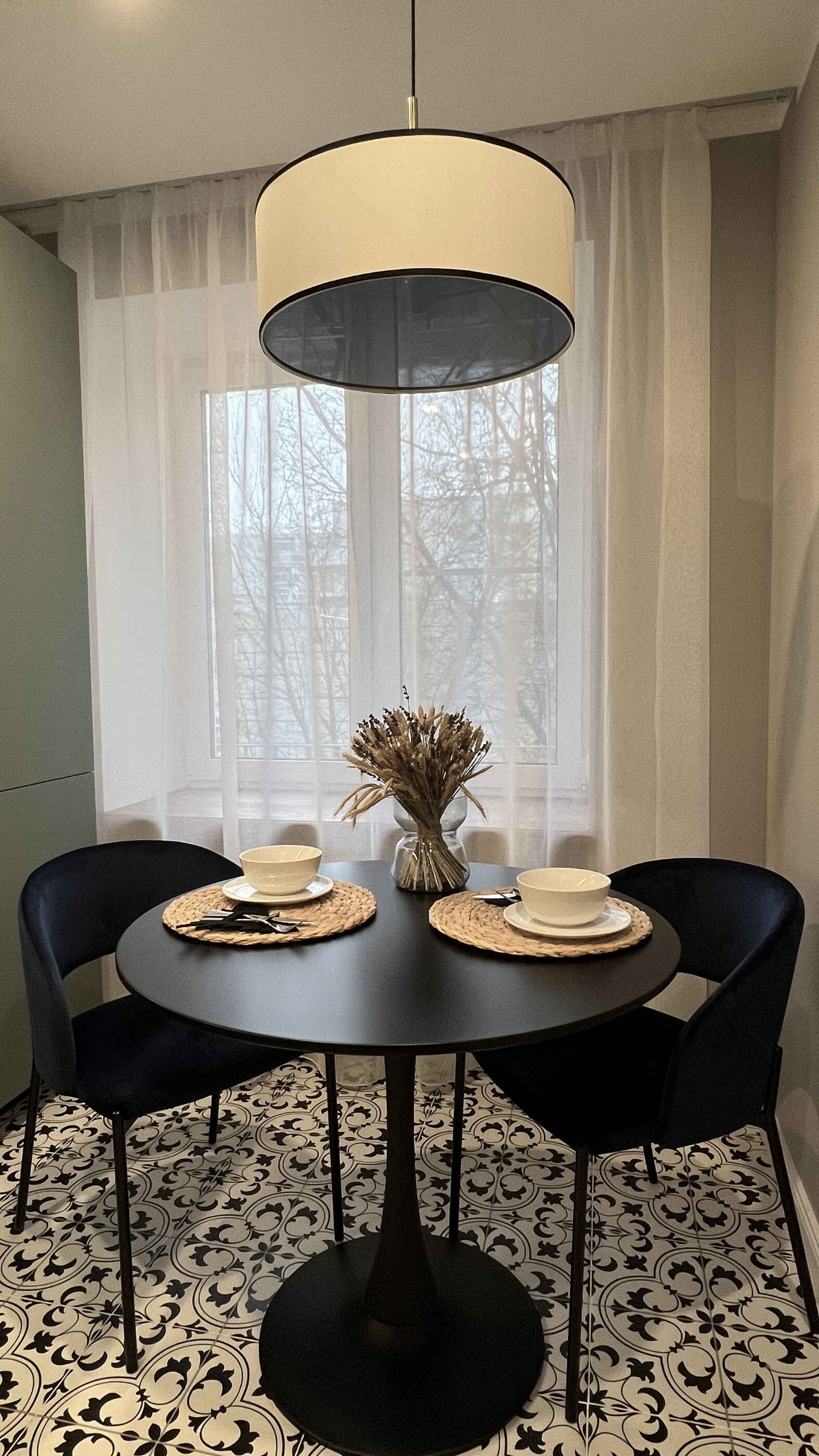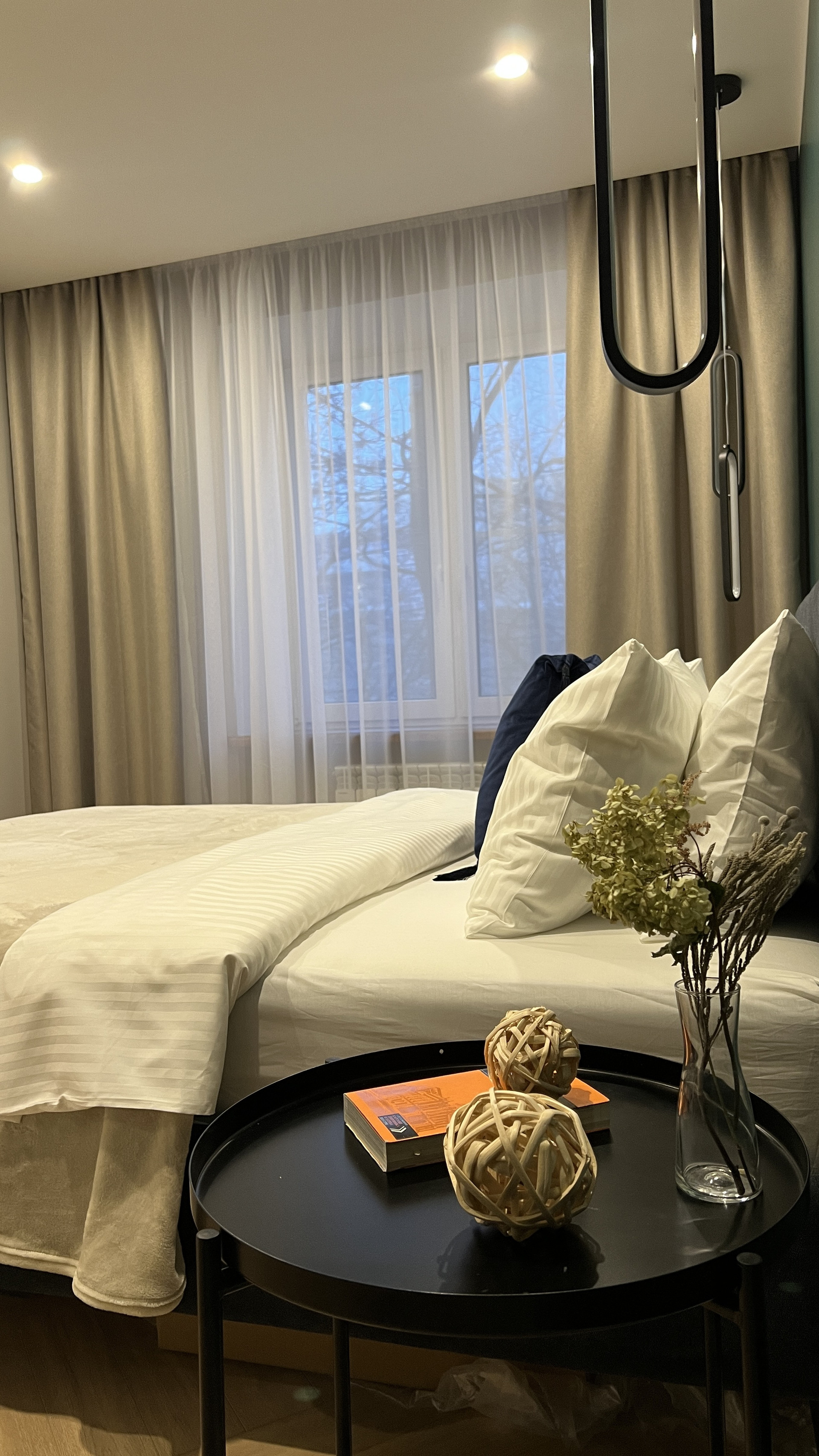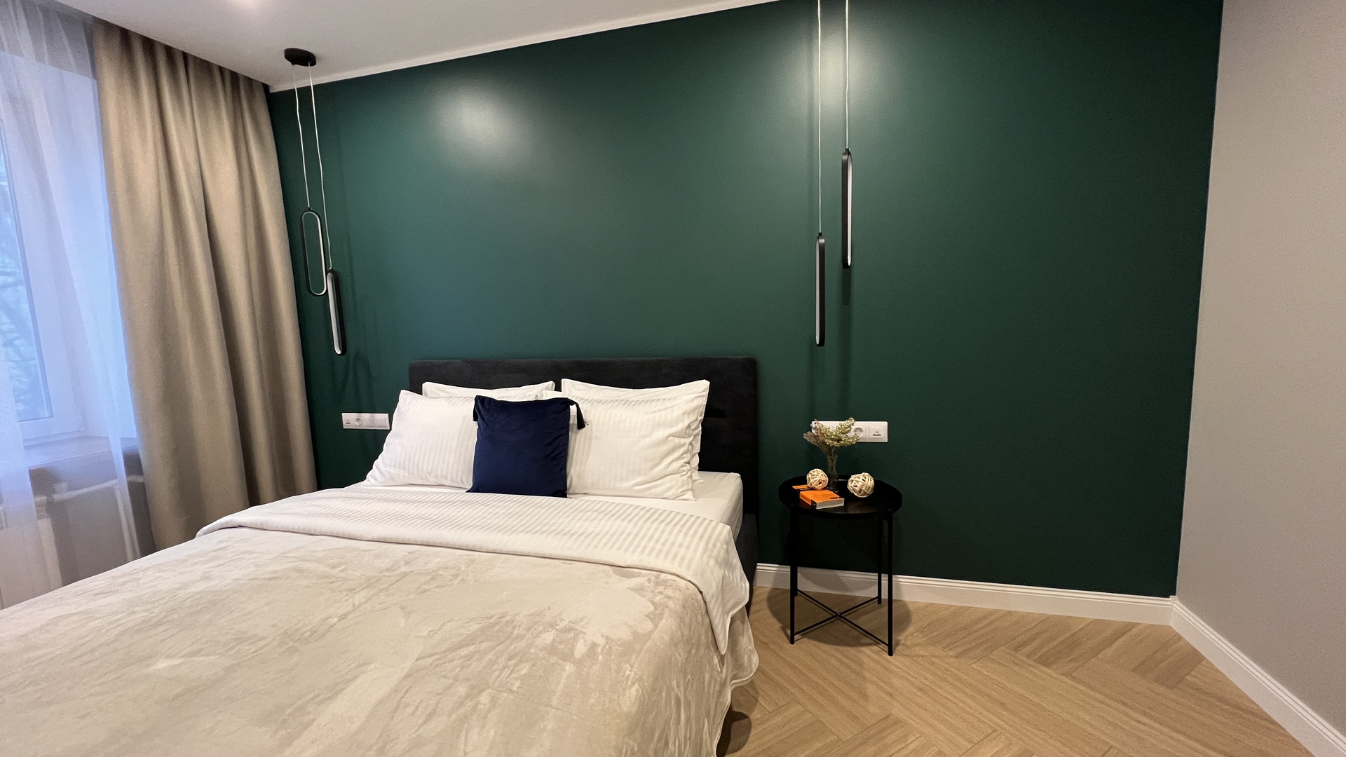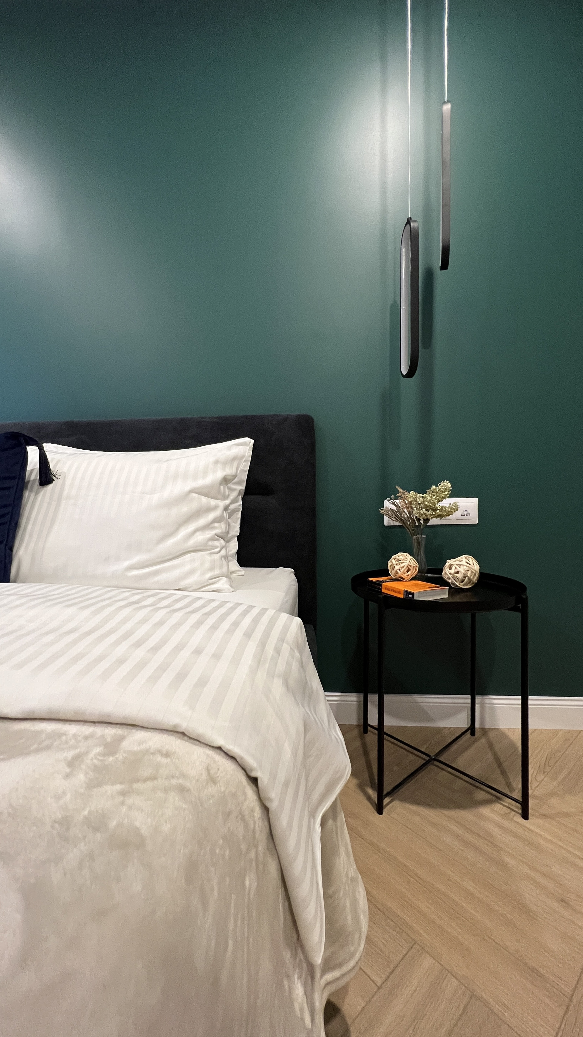 По обеим сторонам кровати предусмотрены места для прикроватных тумбочек, над которыми установлены дизайнерские светильники-подвесы с возможностью смены холодного и теплого освещения.