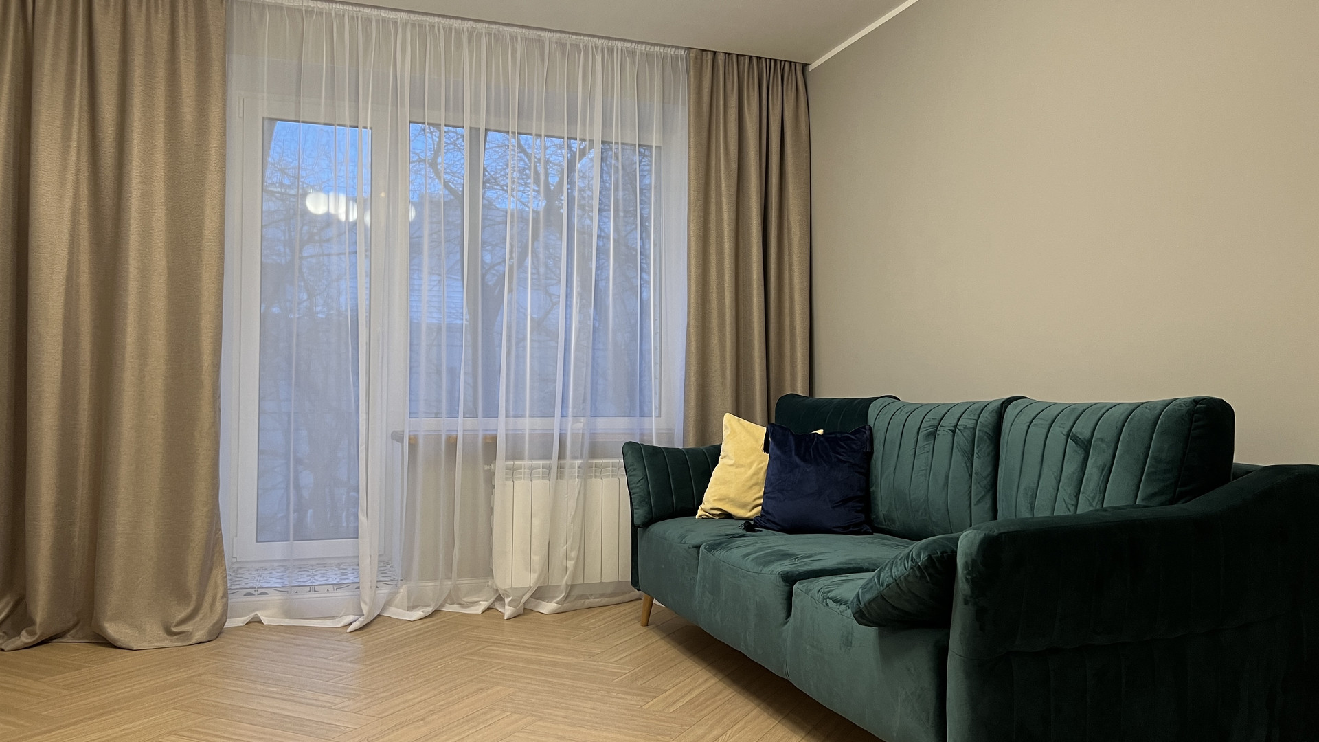 В зоне кухни и санузла установлен теплый пол. Подоконники в квартире – дубовые. На полу – дорогой износостойкий ламинат под дуб, уложенный елочкой.