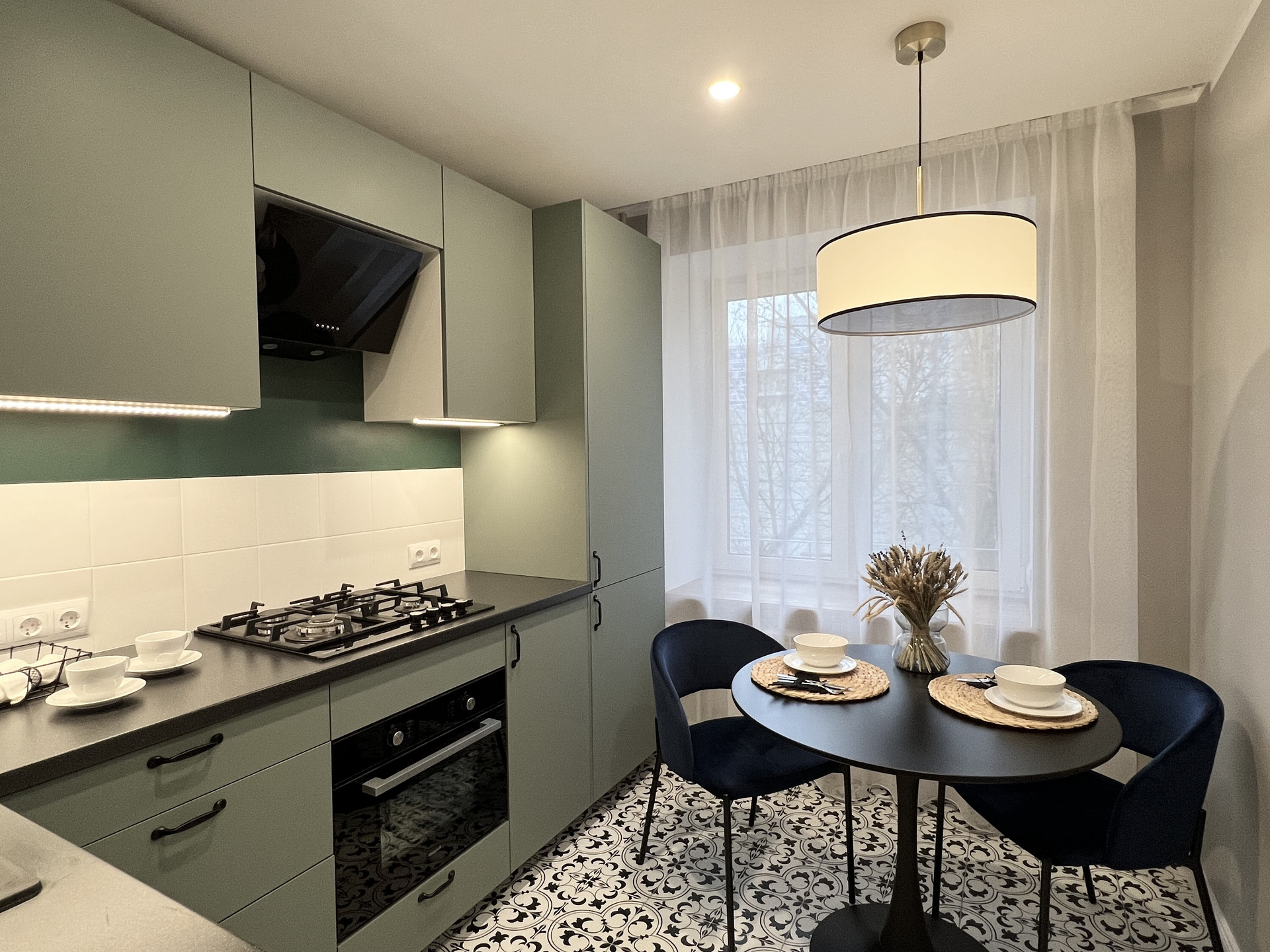 - Кухня – 7,6 м2. Установлена новая мебель и бытовая техника, в том числе: полноразмерный холодильник с морозильной камерой, посудомоечной машиной, духовым шкафом с СВЧ, вытяжкой и газовой варочной панелью на 4 конфорки.