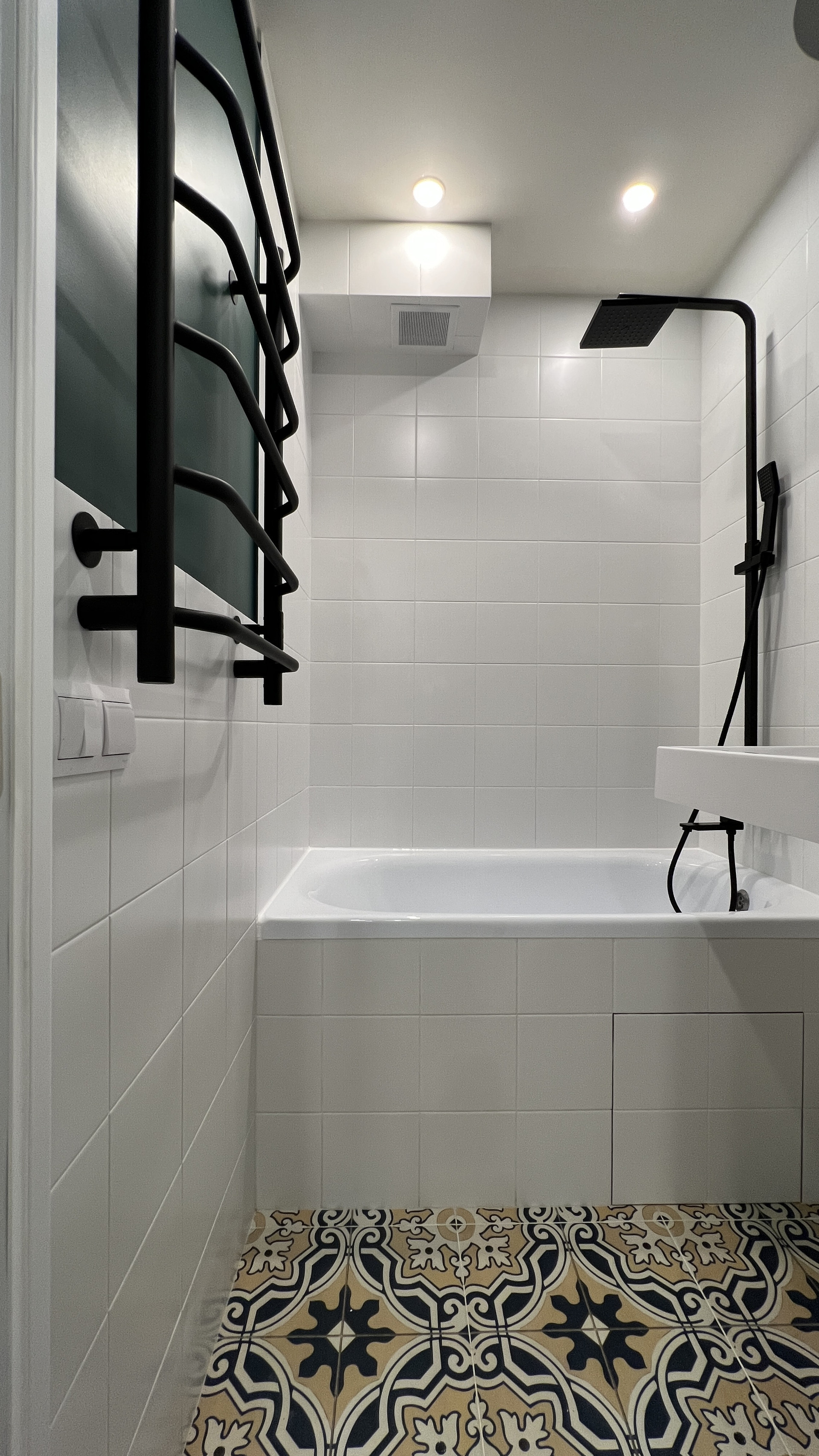 В зоне ванны установлена раковина, под которой предусмотрено место для стиральной машины;