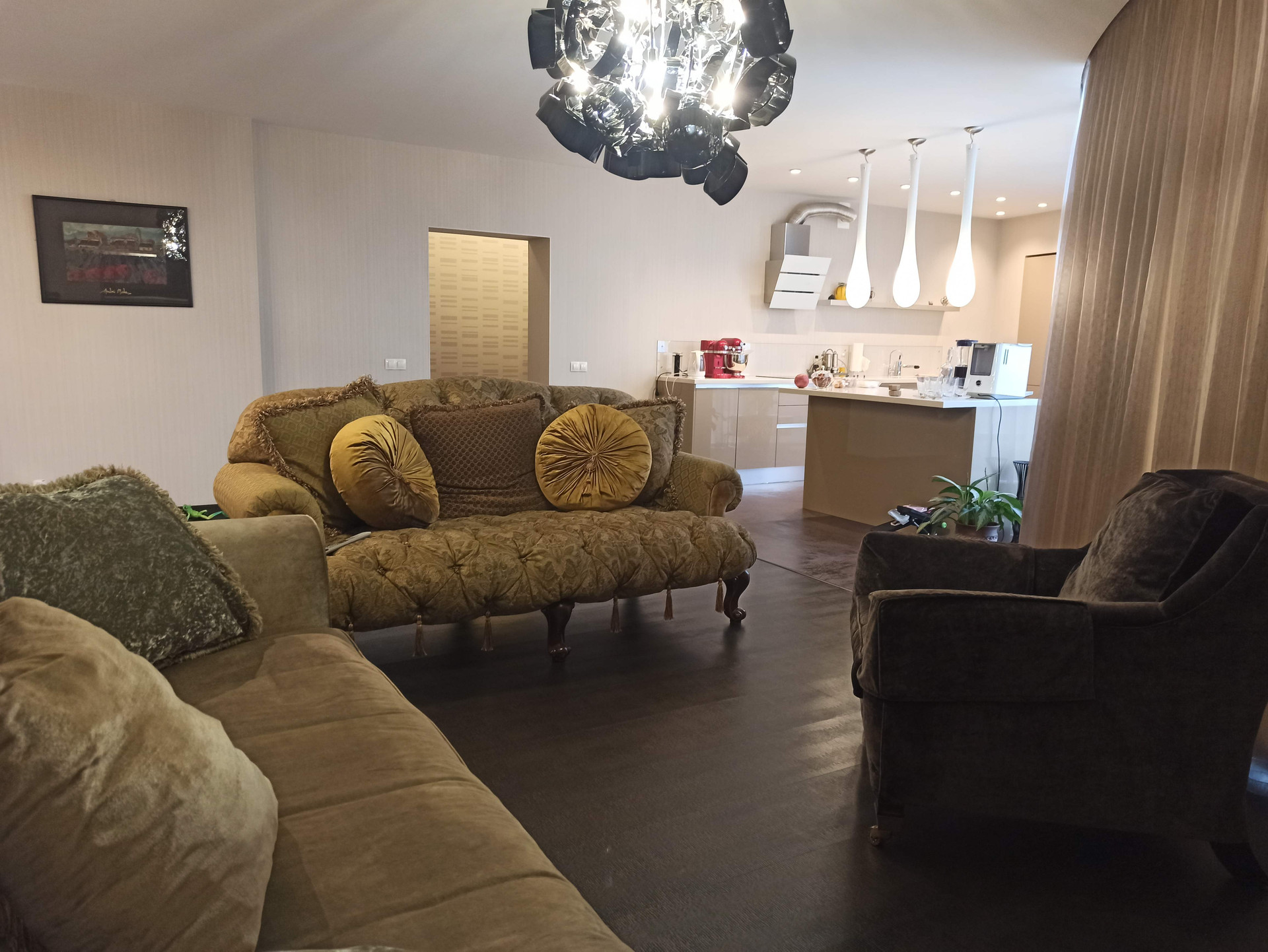 О квартире: Интересна планировка, два санузла, кухня объединена с гостиной, в гостиной панорамные окна, просторная спальня с застекленной лоджией и гардеробной, высококачественный ремонт с применением импортных материалов.