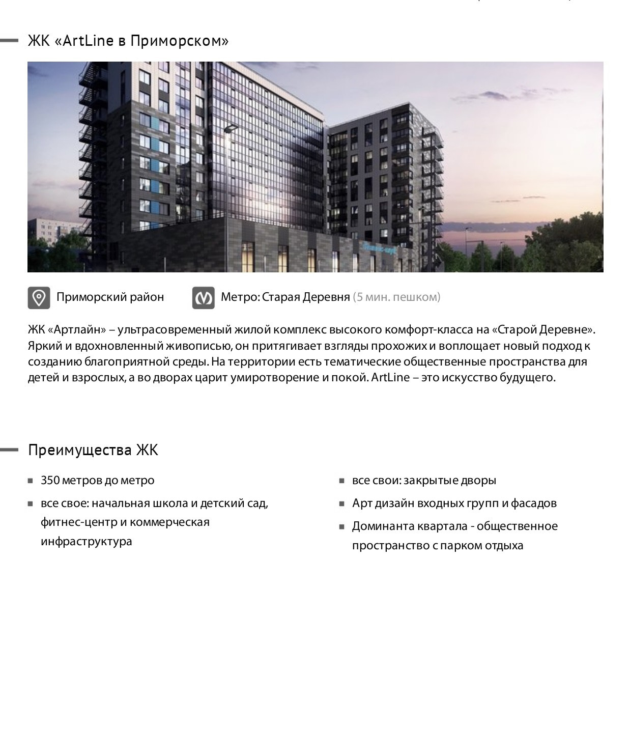 «ArtLine в Приморском» – ультрасовременный жилой комплекс высокого комфорт-класса на «Старой Деревне». Измените ваш взгляд на комфортную жизнь.
