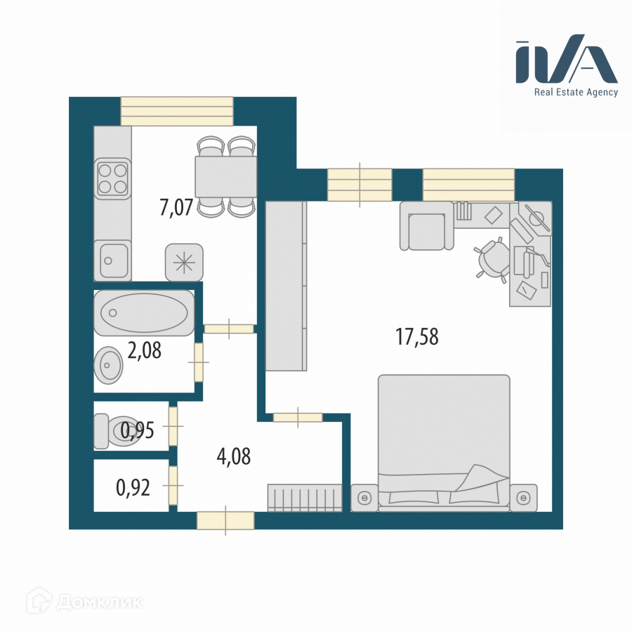 О квартире: квартира общей площадью 32,8 м2.), кухня 7 м2, комната 17,58 м2, раздельный санузел, встроенная кладовая-гардеробная, высота потолков 2,65 м. Квартира теплая и светлая, окна выходят во двор.