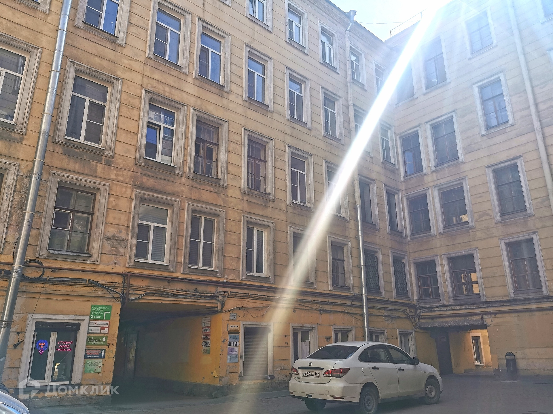 Просторная ухоженная парадная ( УК недавно выполнила ремонт). Во внутреннем, закрытом,  дворе наземная парковка личных автомобилей жильцов. На первом этаже здания располагаются : пекарня, юридическая служба, центр бытовых услуг.