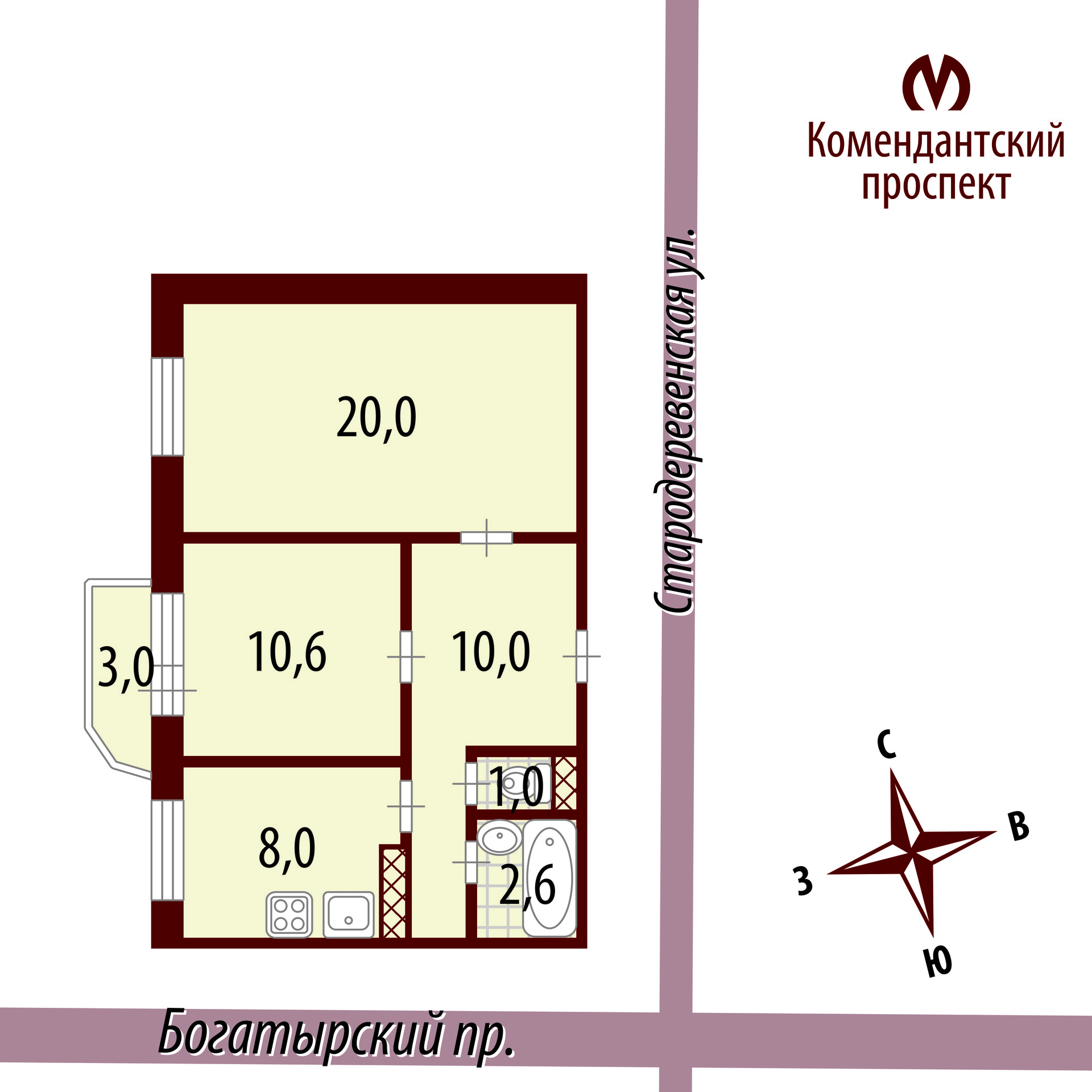 Комнаты: 20.0 кв. м. - 10.6 кв. м. . Кухня 8 кв.м.
