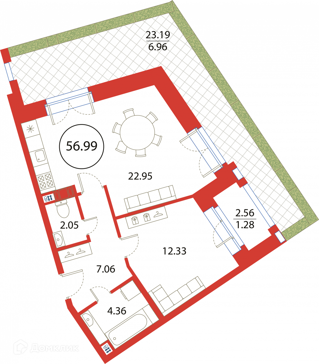 Общая площадь 56.99 м2