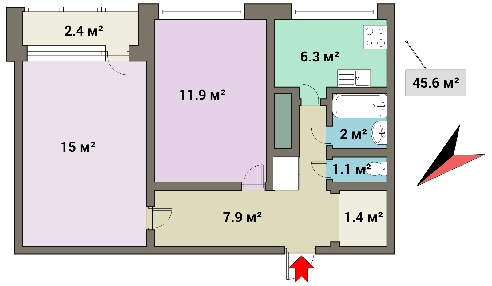 Общая площадь 45.6 м2