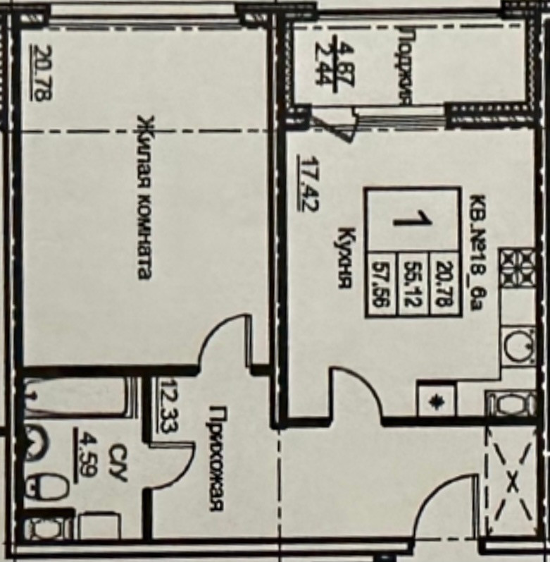 Общая площадь квартиры – 57,6м. Комната – 20,5м. Кухня 17,5м, имеется просторная лоджия – 2,5м, большая просторная прихожая – 12,4м, где может разместиться гардеробная. В квартире большие окна с трехкамерными стеклопакетами  и высокой шумоизоляцией,  высотой 1,8м, которые выходят во двор. Высокие потолки 3 м.система inHome: вы можете в любом месте и в любое время иметь доступ и контролировать вашу квартиру с  телефона.