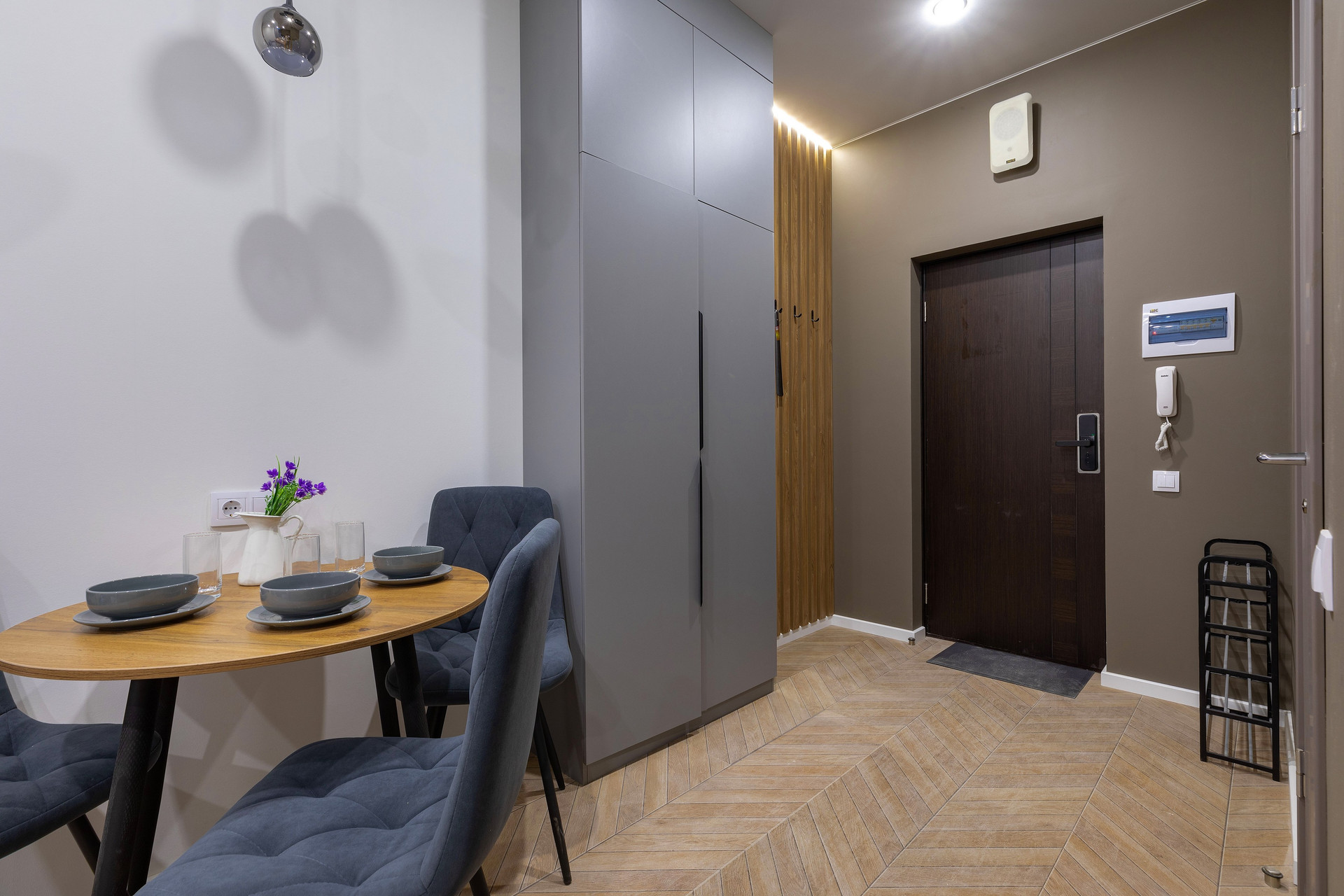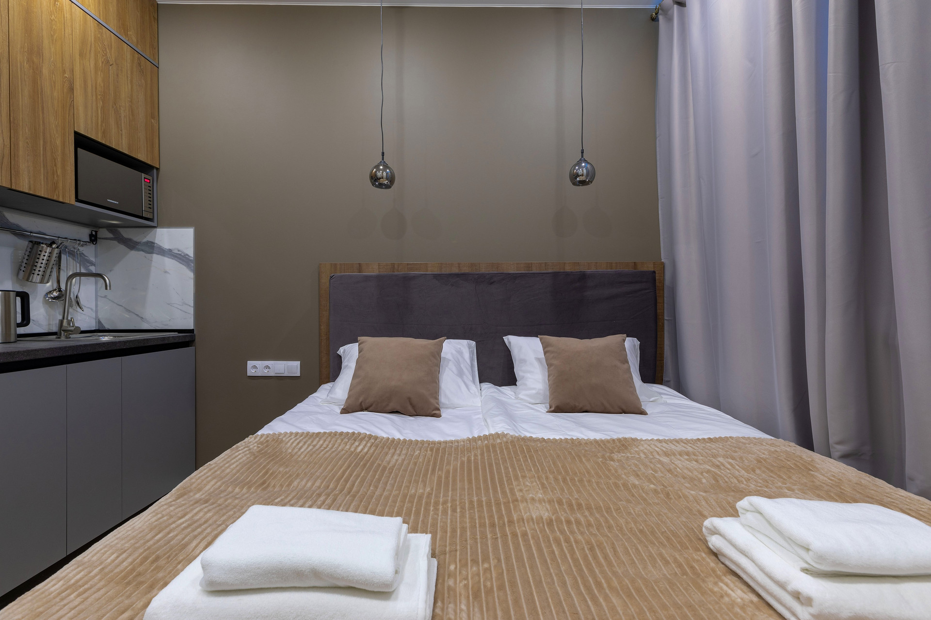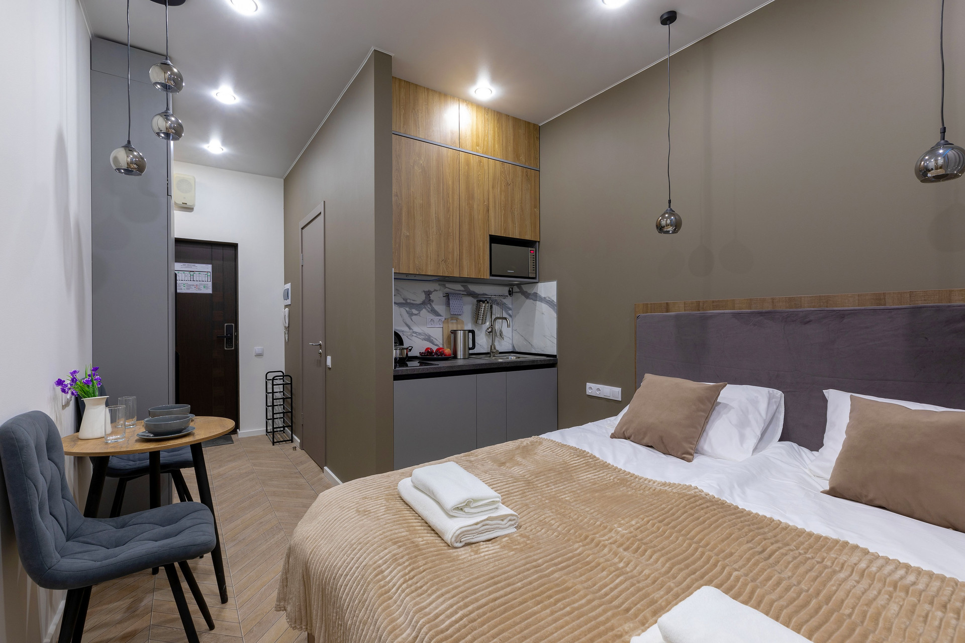 Кухня полностью оборудована техникой (варочная панель, микроволновка, холодильник,