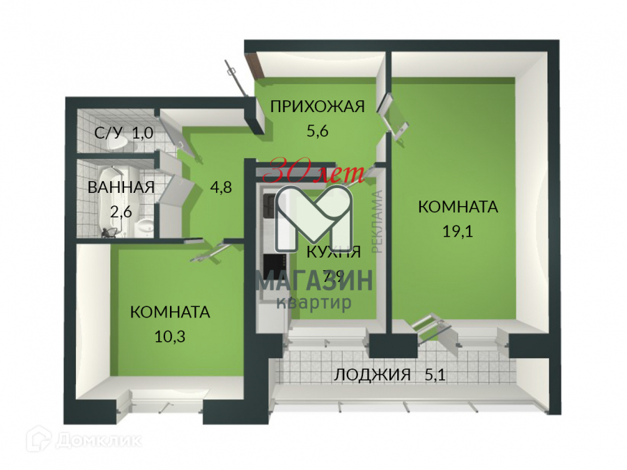 Общая площадь 51.3 м2