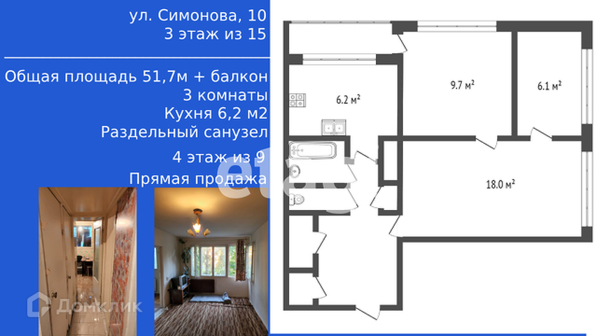 3-комнатная квартира, 51.7 м2, этаж 3 / 15, на продажу в Санкт-Петербурге, улица Симонова, 10к1