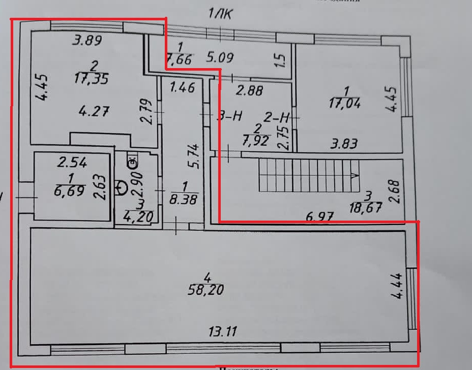 - Площадь комнат: 58,2+17,35