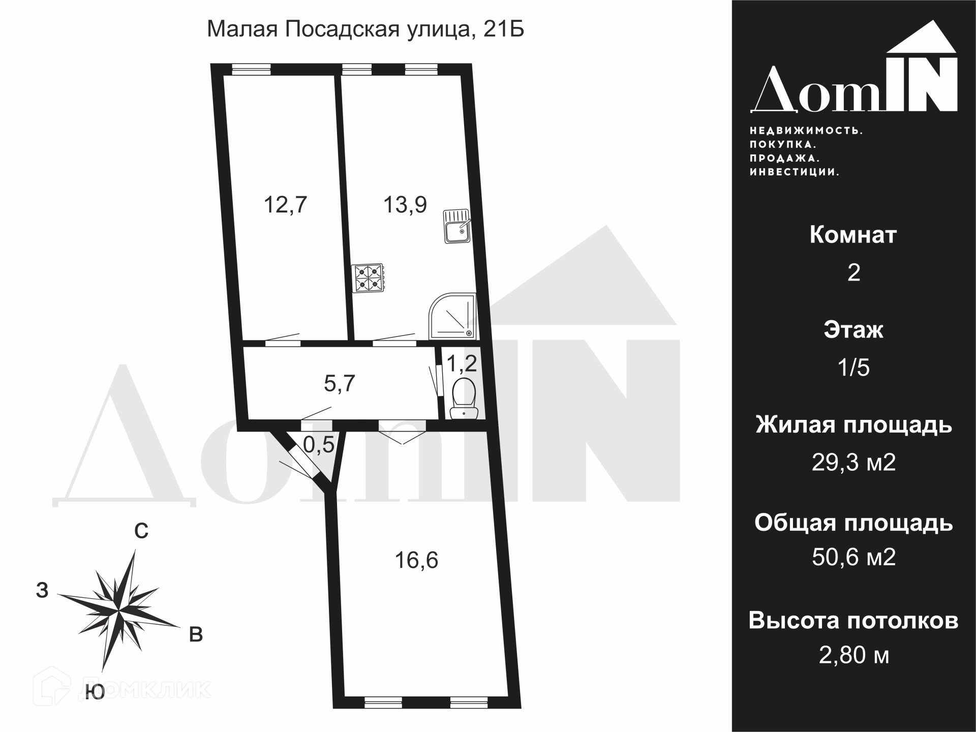2-комнатная квартира, 50.6 м2, этаж 1 / 5, на продажу в Санкт-Петербурге, Малая Посадская улица, 21Б
