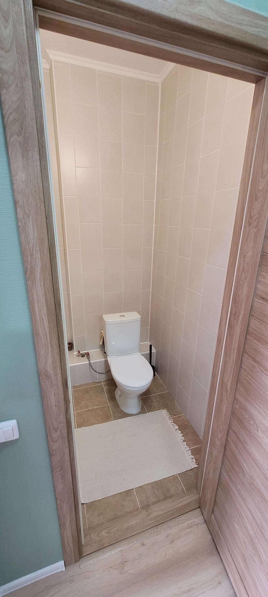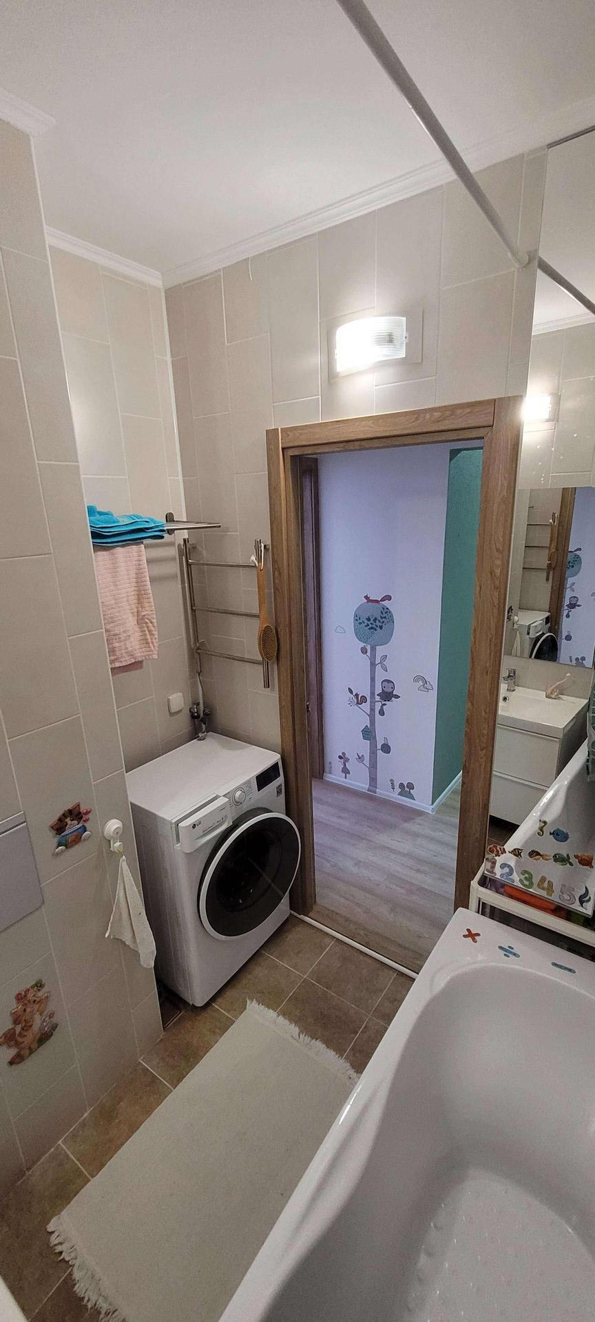 В ванной стиральная машина LG с сушкой.