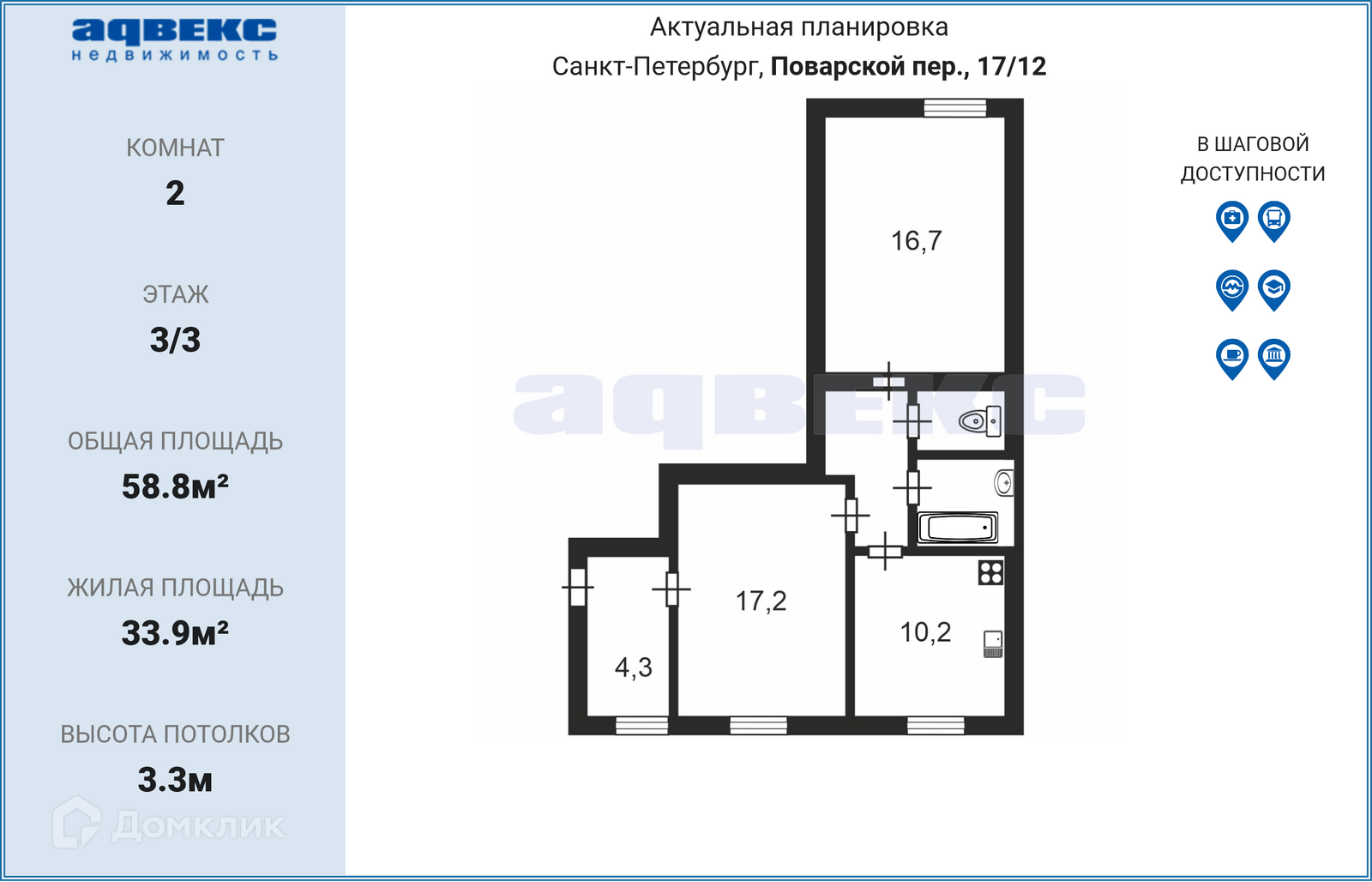 2-комнатная квартира, 58.8 м2, этаж 3 / 3, на продажу в Санкт-Петербурге, Поварской переулок, 17/12