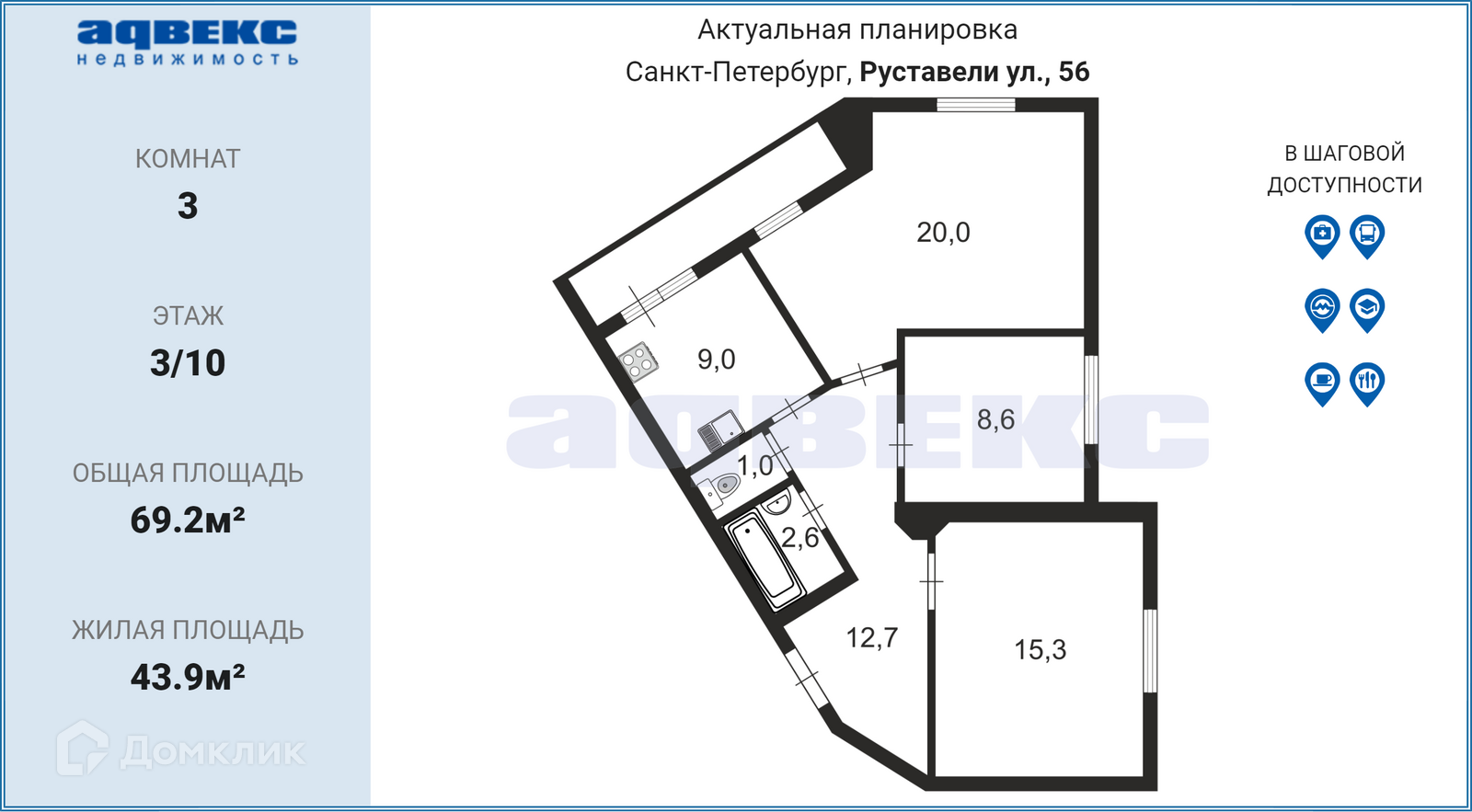 3-комнатная квартира, 69.2 м2, этаж 3 / 10, на продажу в Санкт-Петербурге, улица Руставели, 56