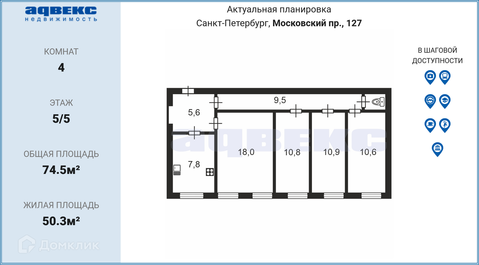 4-комнатная квартира, 74.5 м2, этаж 5 / 5, на продажу в Санкт-Петербурге, Московский проспект, 127