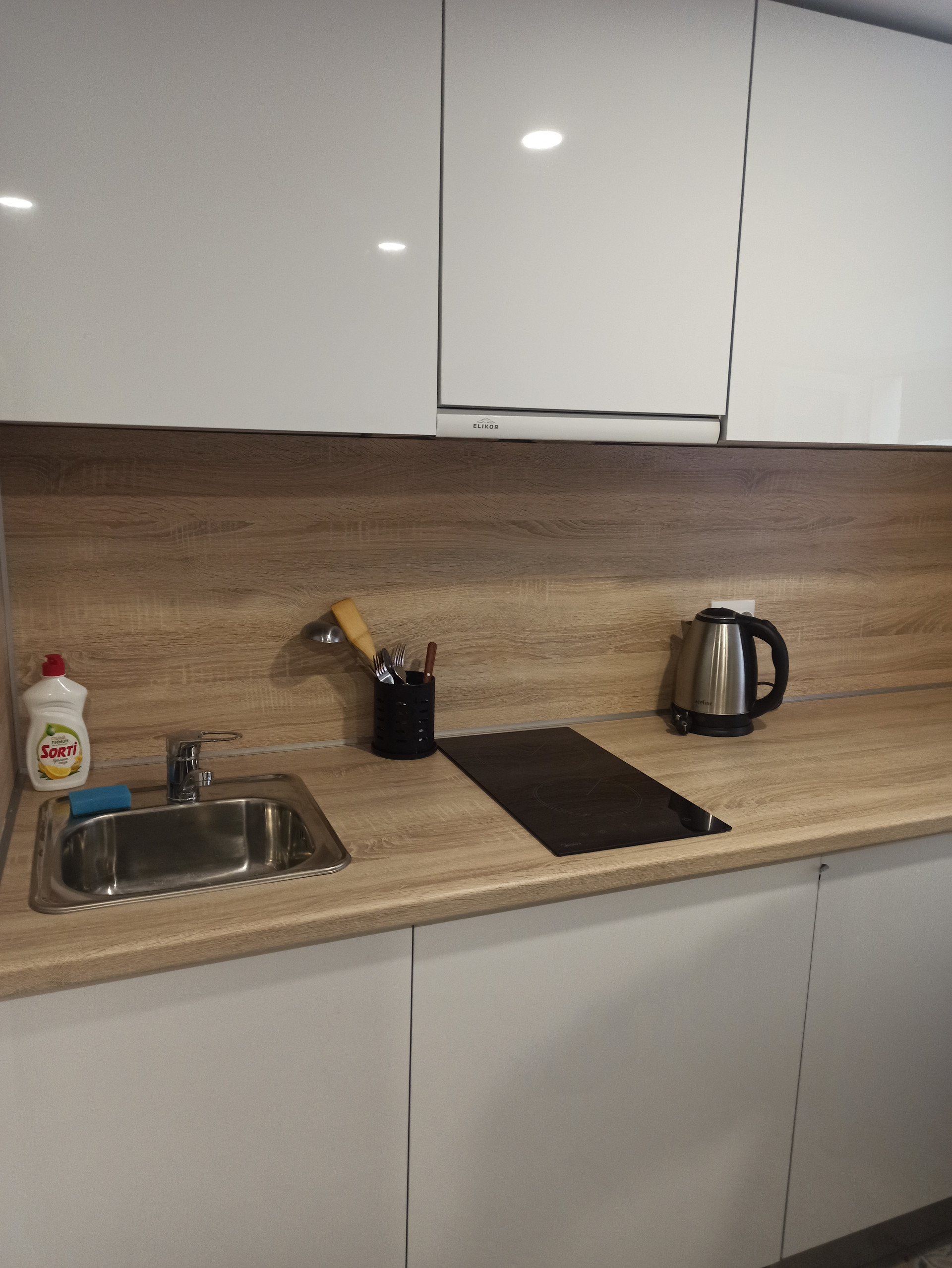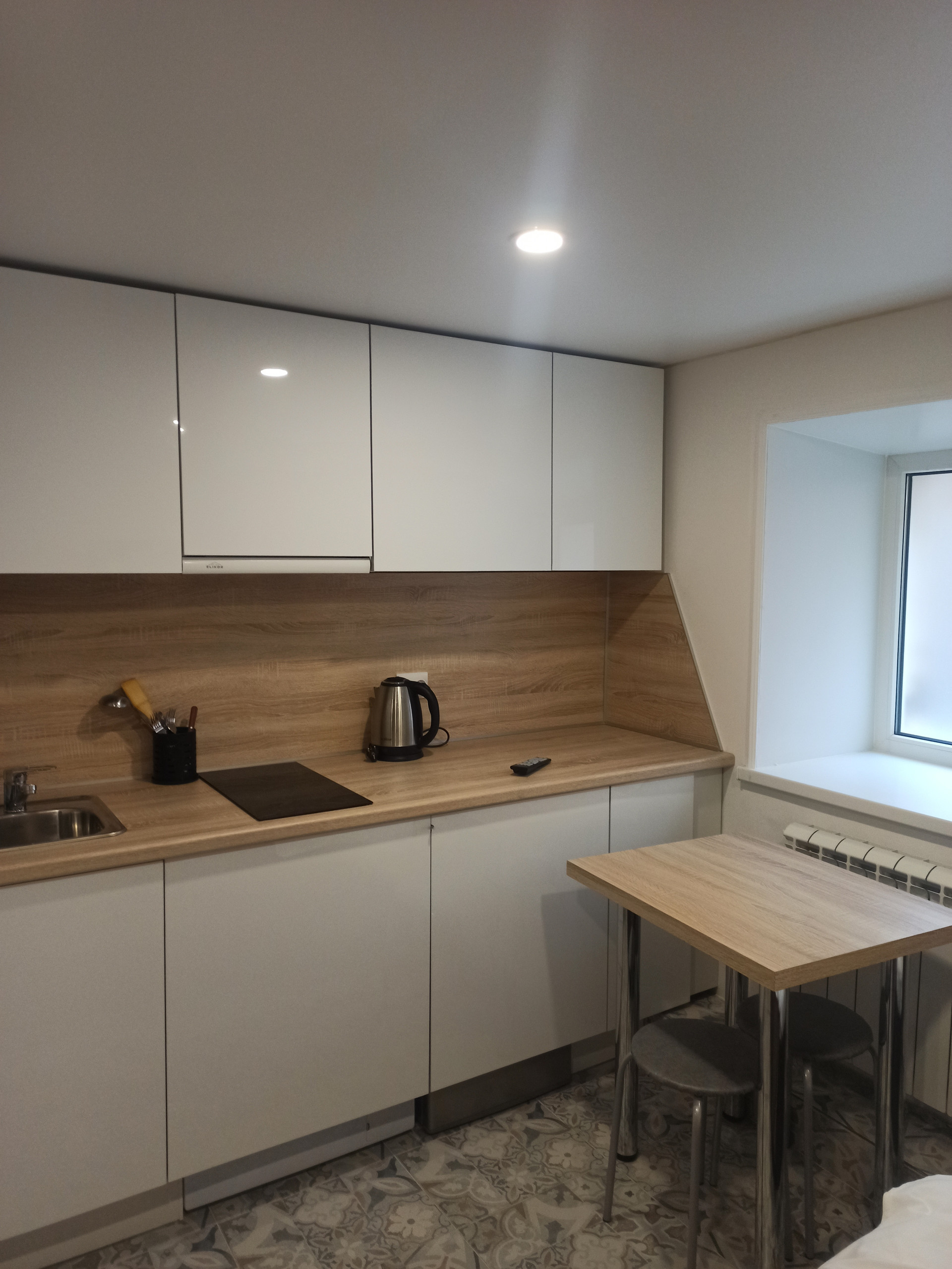 Кухонный гарнитур, индукционная плита, телевизор, 2-спальная кровать, два стула, стол, зеркало, холодильник, стиральная машина, и электрочайник.