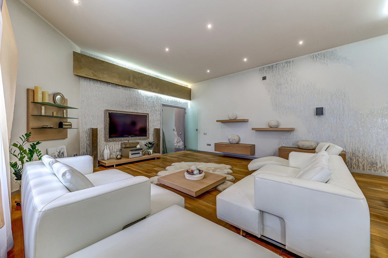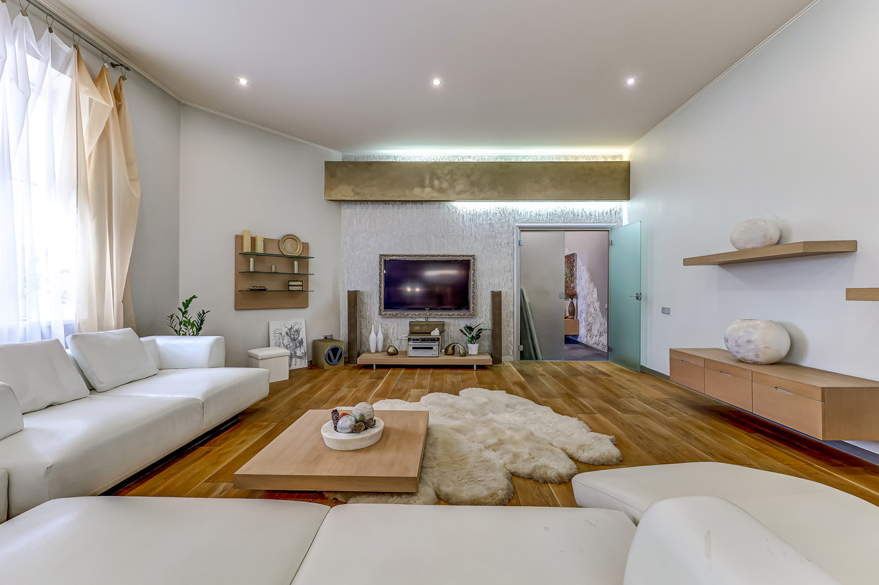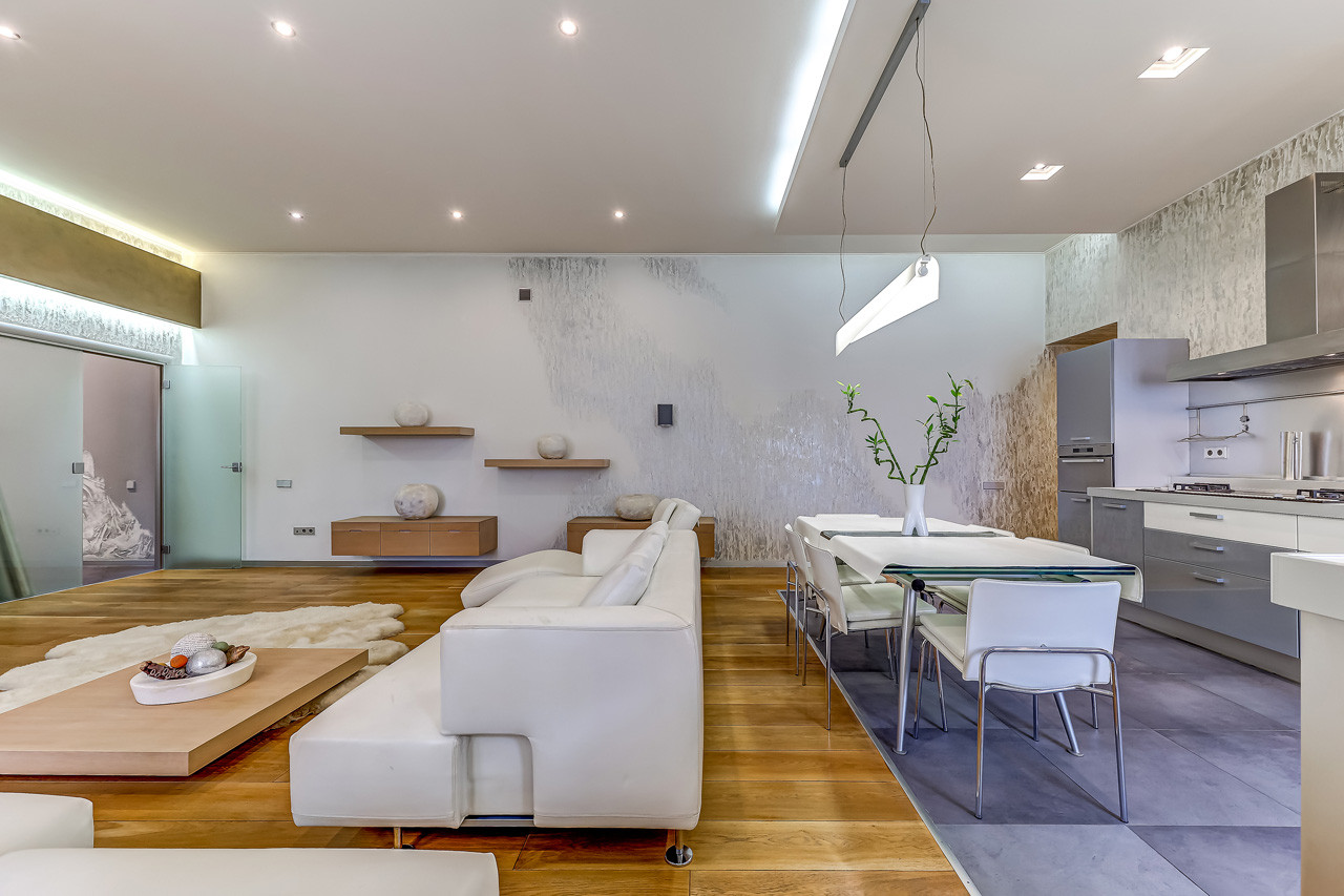 На данный момент квартира состоит из 3 комнат, включая большую кухню-гостинную, 2 санузла, 2 гардеробные, кладовка.