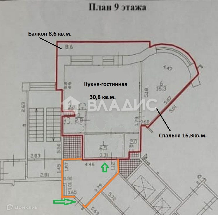 Общая площадь евродвушки 58,3 кв.м (+балкон 8,6м и тамбур - не считается в общую площадь документам), этаж 9/10