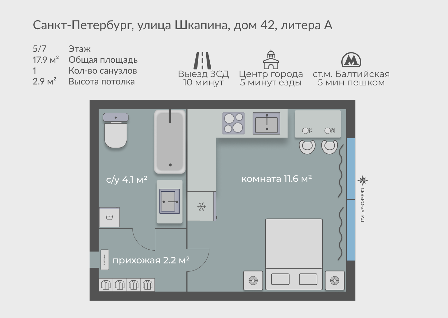 Однокомнатная студия в 5 минутах ходьбы от метро «Балтийская» в Адмиралтейском районе.