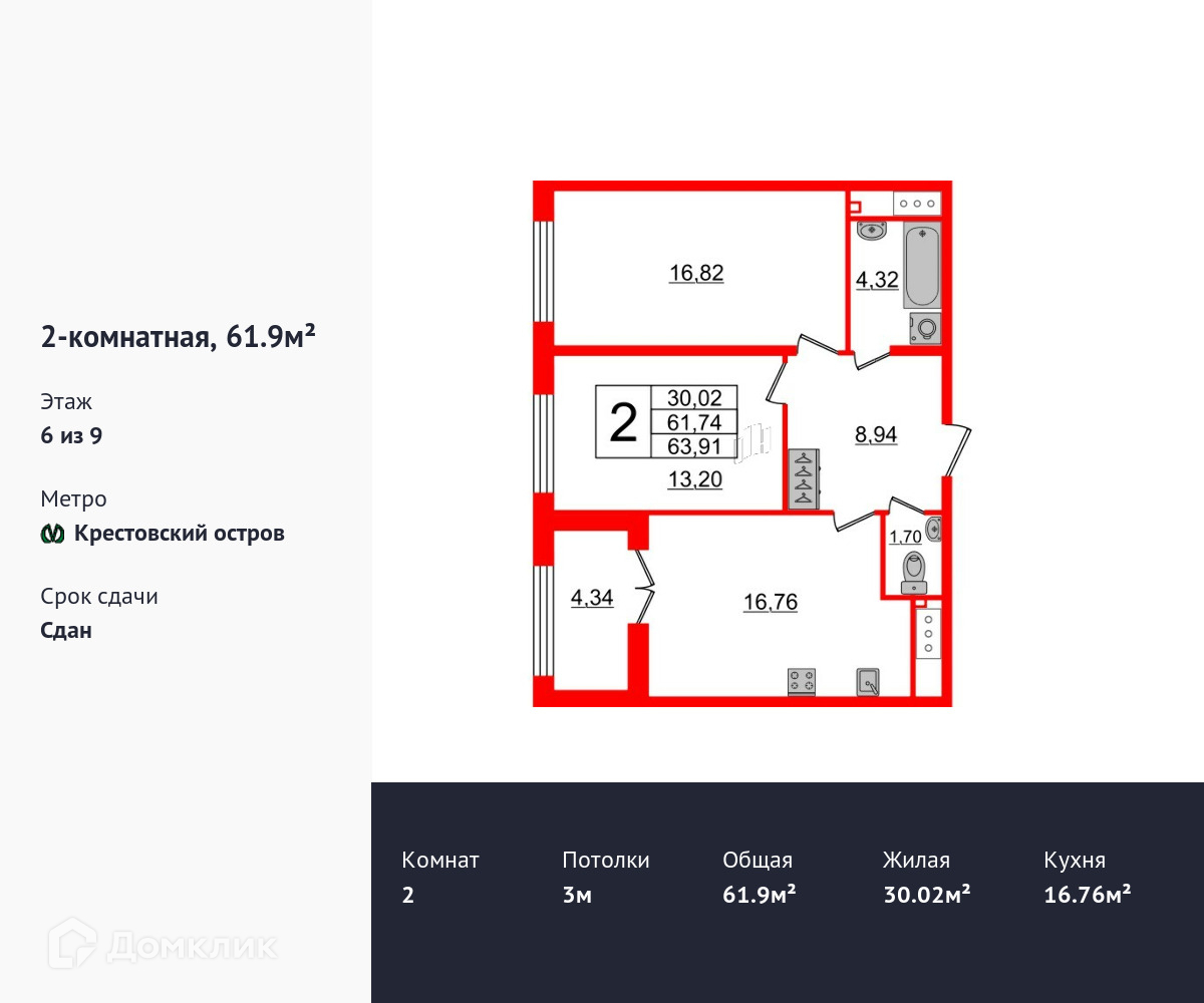 Общая площадь 61.9 м2