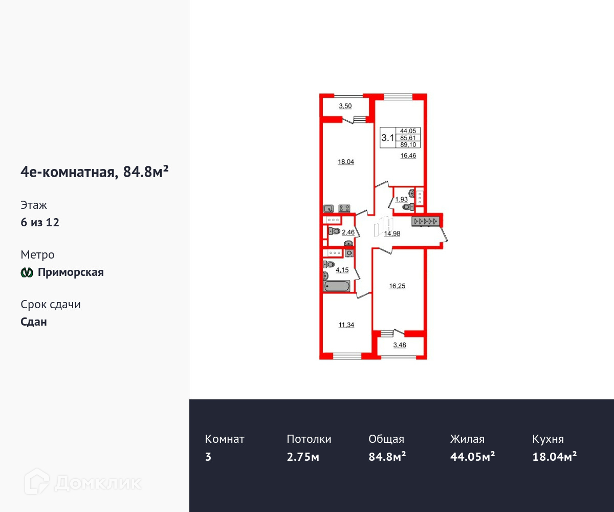 3-комнатная квартира, 84.8 м2, этаж 6 / 12, на продажу в Санкт-Петербурге, Уральская улица, 21