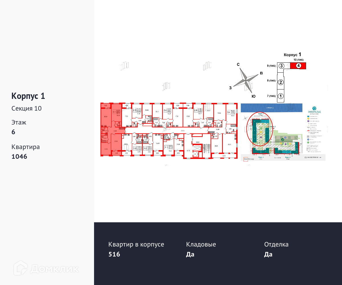 В проекте предусмотрены семейные секции больших квартир. Часть корпусов «Эмеральд» выходит к воде: из окон квартир будут открываться уникальные, ранее недоступные виды на набережную, Неву, новый стадион, Лахта Центр и весь Петербург. В проекте представлены уникальные планировки: трехсторонние трехкомнатные квартиры, квартиры с зимним садом и с возможностью установить сауну. Все они сдаются с готовой отделкой «Итальянские коллекции» Vanile («Ваниль») и Chocolate («Шоколад»).