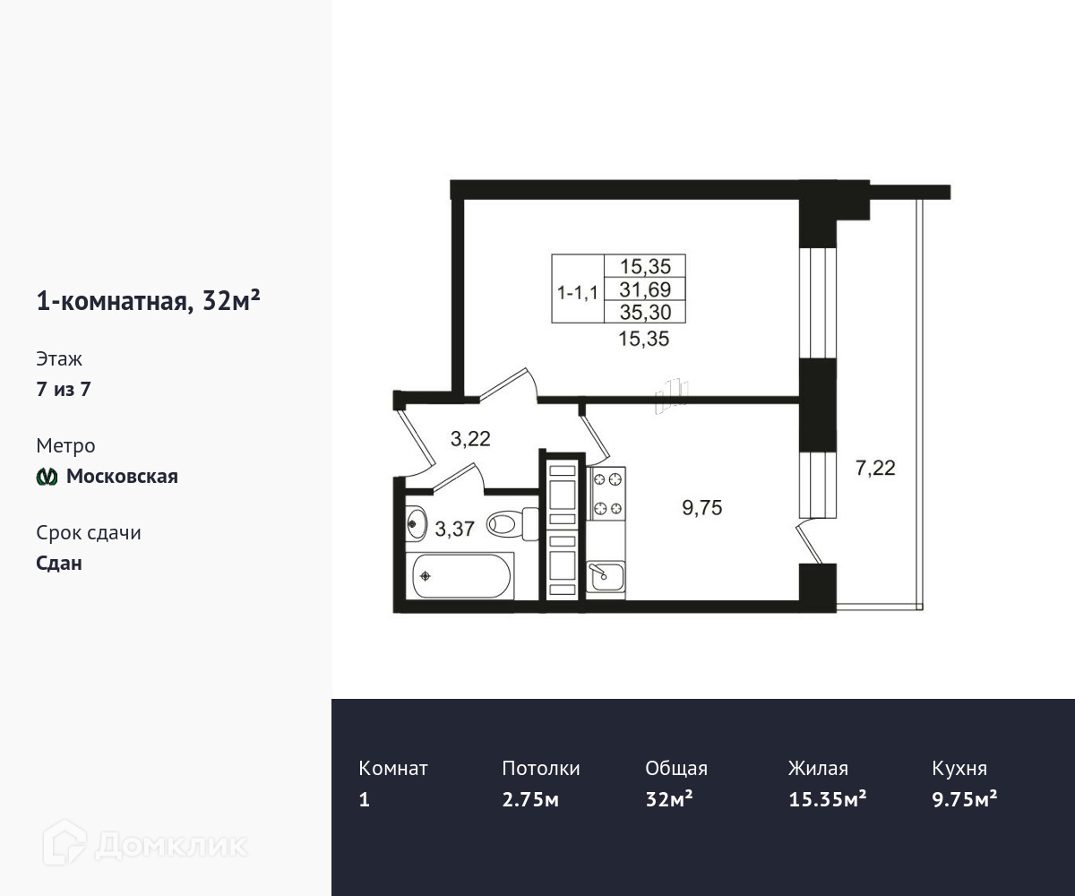 Продаются однокомнатные апартаменты в ЖК Москва площадью 32 м2 (жилая площадь – 15.35 м2). Апартаменты расположены рядом с метро Московская. Расстояние до метро 10 Мин.пешком. Площадь кухни 9.75 м2. Площадь прихожей 3.22 м2. Высота потолка 2.75 м. Санузел – совмещенный. Балкон. Чистовая отделка.