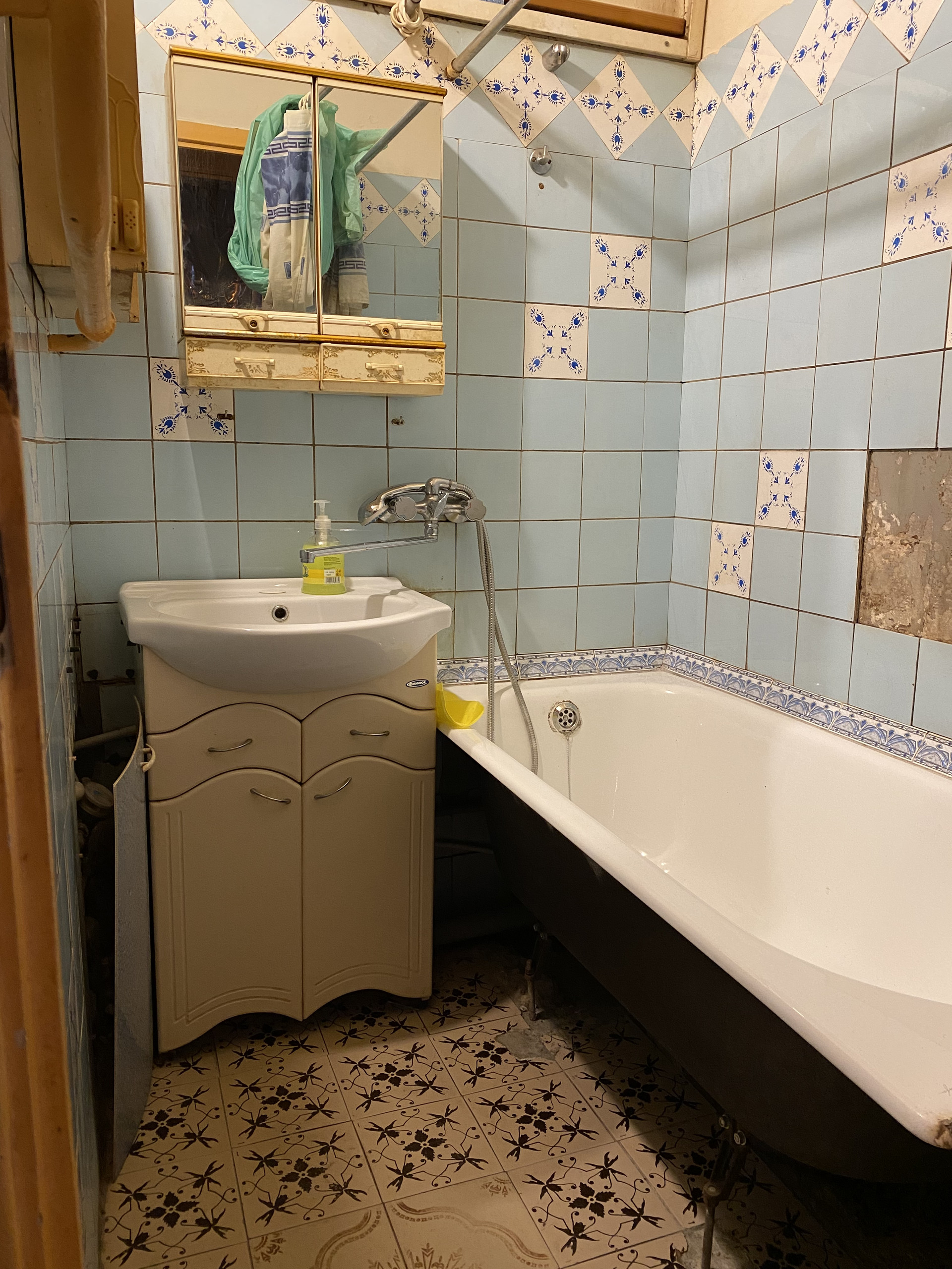Санузел и плитка в ванне требуют небольшого косметического ремонта, в тч после недавней замены стояков. Не стали ничего обшивать. (То чем было зашито раньше-осталось).
