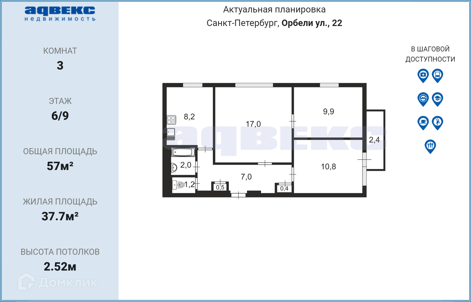 3-комнатная квартира, 57 м2, этаж 6 / 9, на продажу в Санкт-Петербурге, улица Орбели, 22