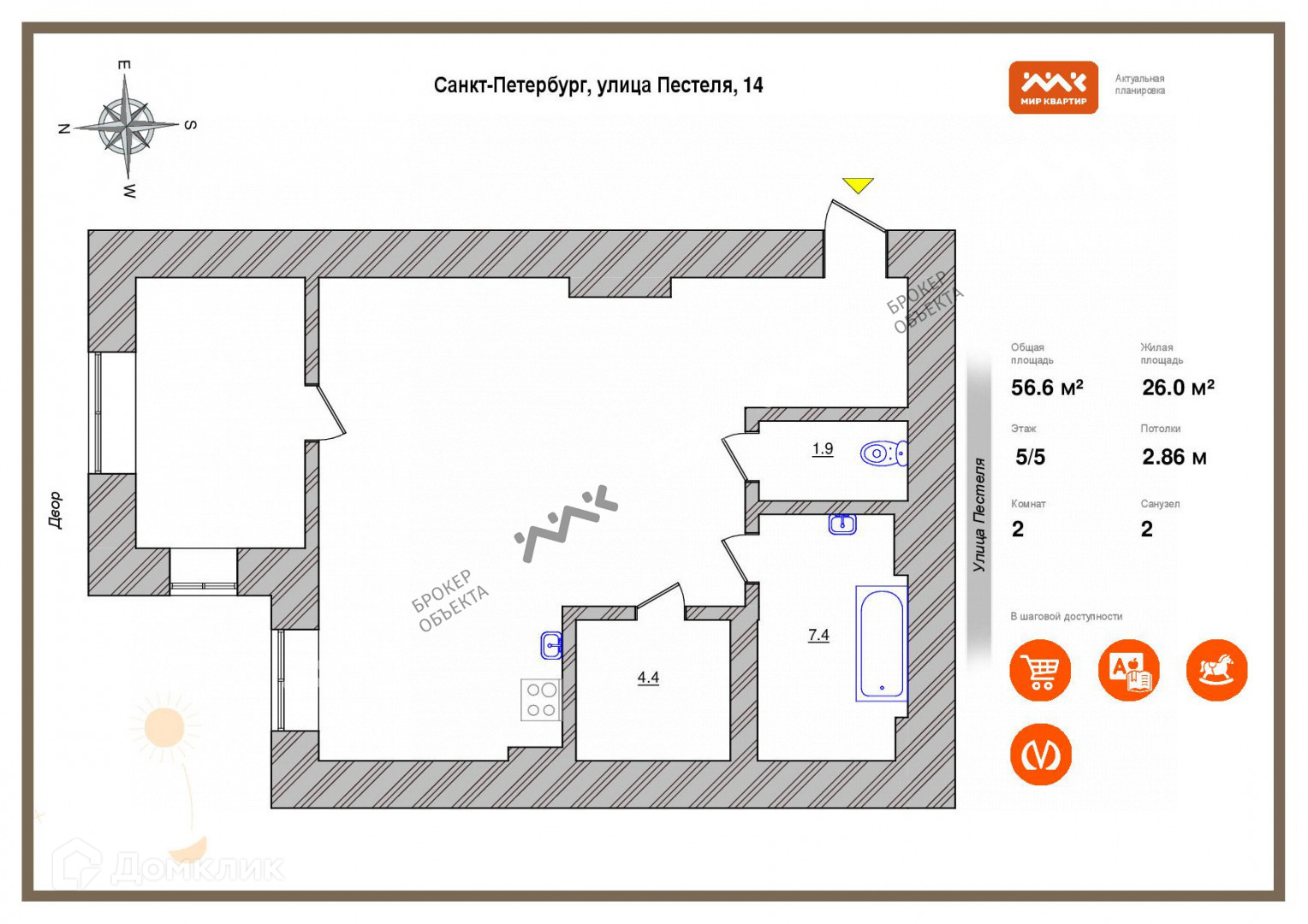 2-комнатная квартира, 58.6 м2, этаж 5 / 5, на продажу в Санкт-Петербурге, улица Пестеля, 14