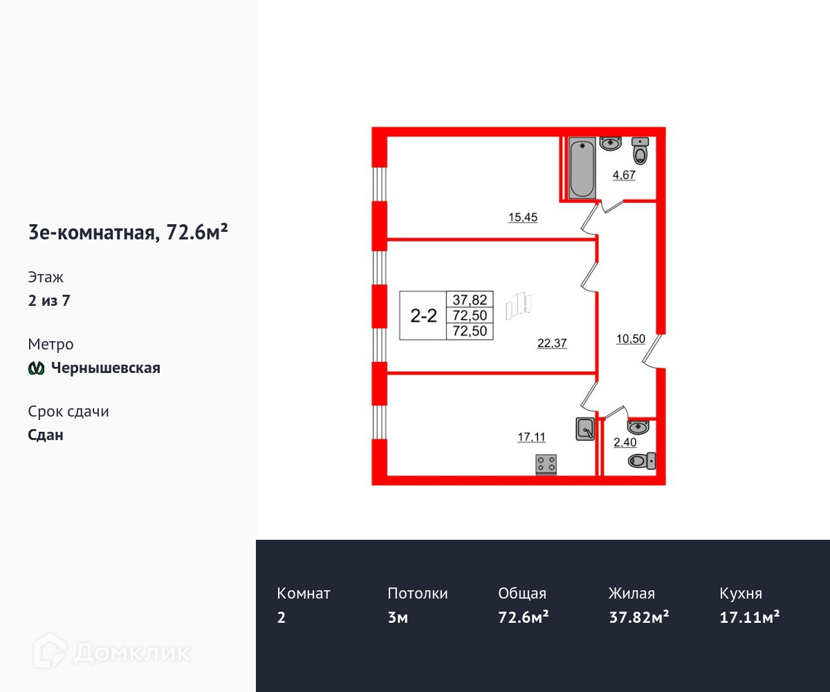 Продается двухкомнатная квартира в ЖК Дом у ратуши площадью 72.6 м2 (жилая площадь – 37.82 м2). Квартира расположена рядом с метро Чернышевская. Расстояние до метро 10 Мин.пешком. Площадь кухни 17.11 м2. Площадь прихожей 10.5 м2. Высота потолка 3 м. Санузел – два санузла. Нет. Без отделки.