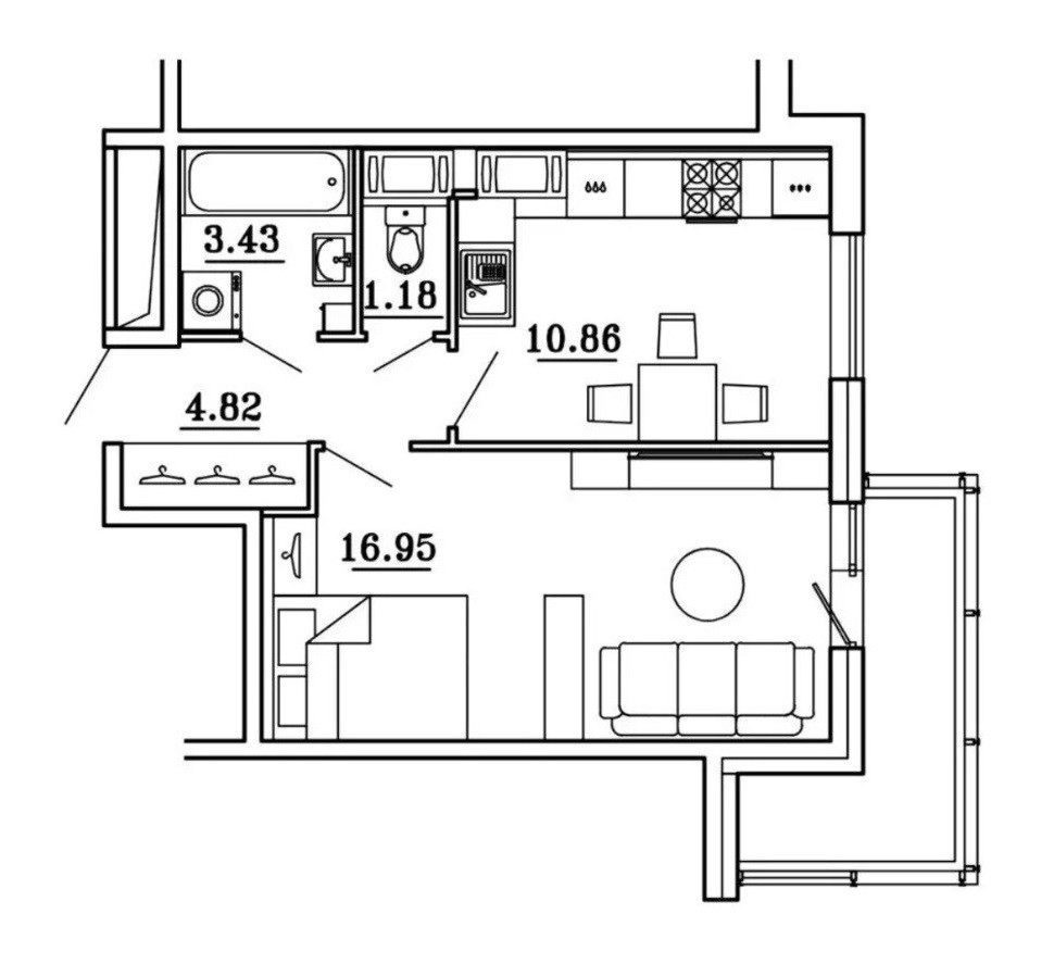 - просторная комната (16,9м) с выходом на лоджию (в ней есть дополнительная зона хранения)