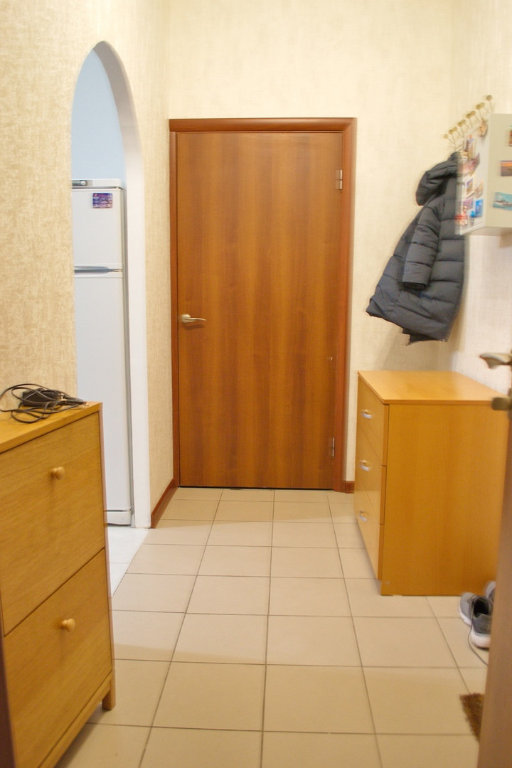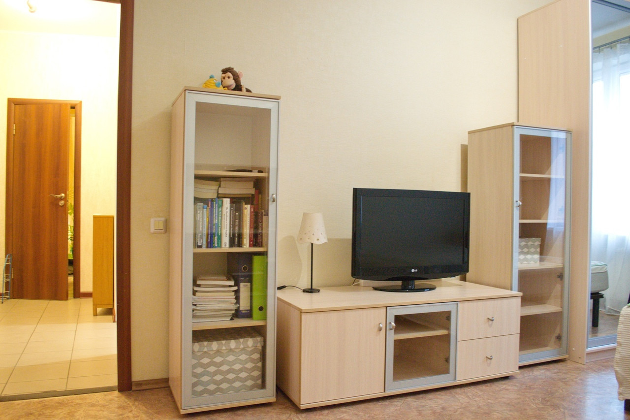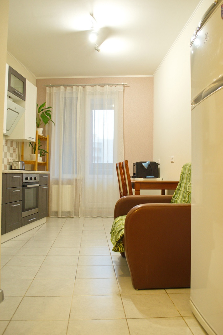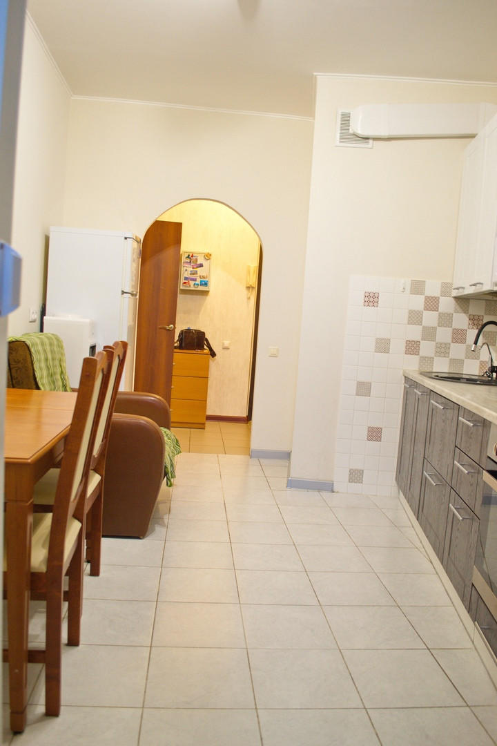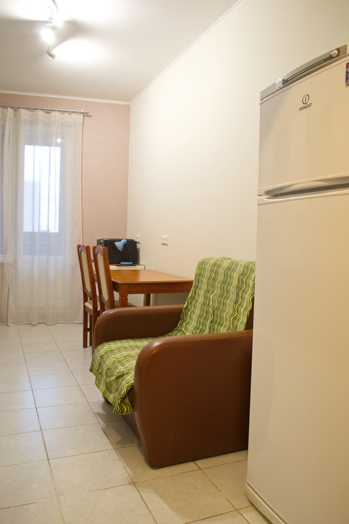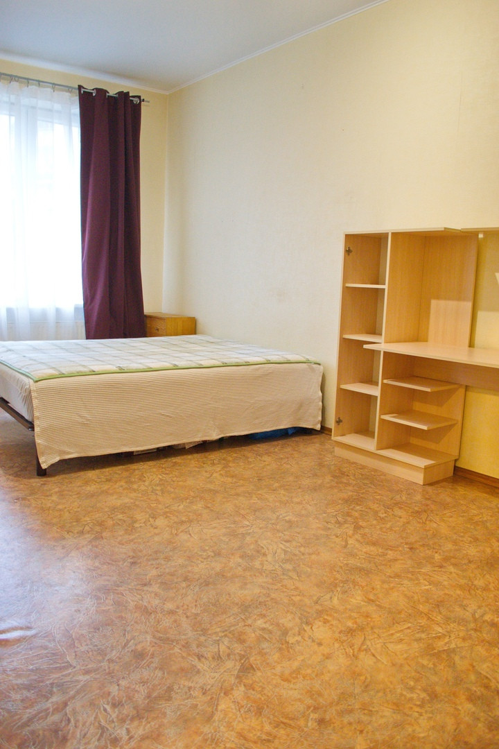 Просторная однокомнатная квартира с видом во двор. Кухня трапецивидной формы с балконом(на балконе отделка, а также блок кондиционера). Комната просторная, пол линолеум, стены обои. Санузел совмещенный в кафеле.