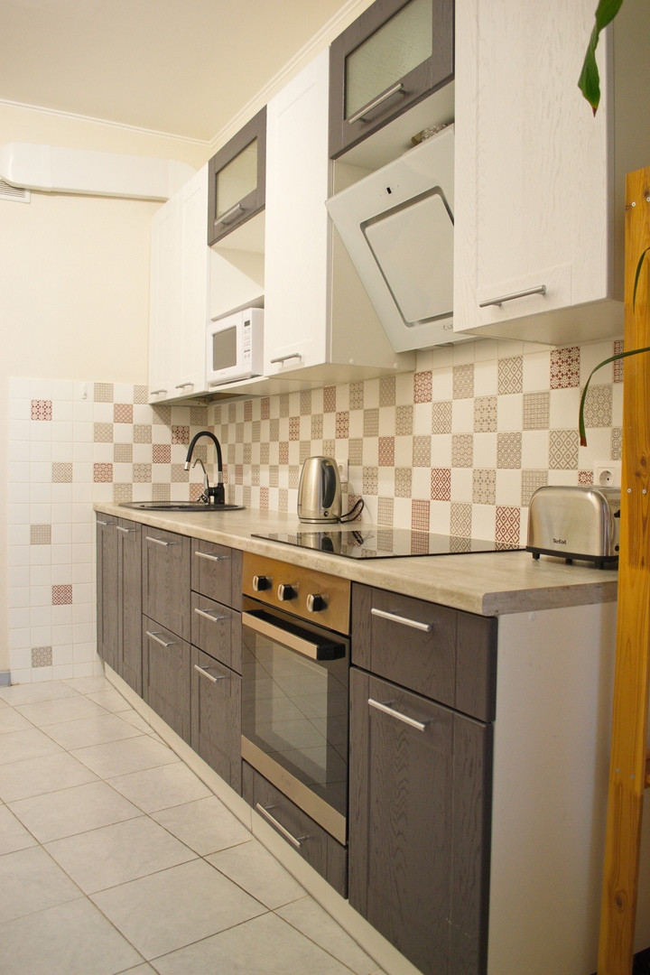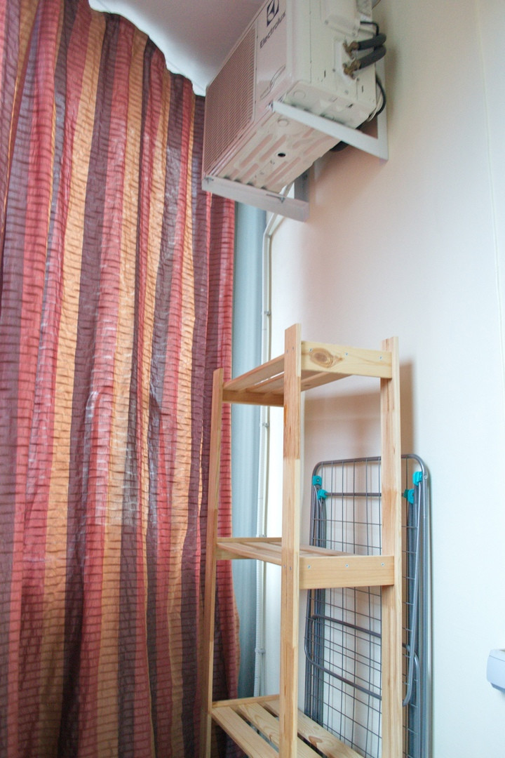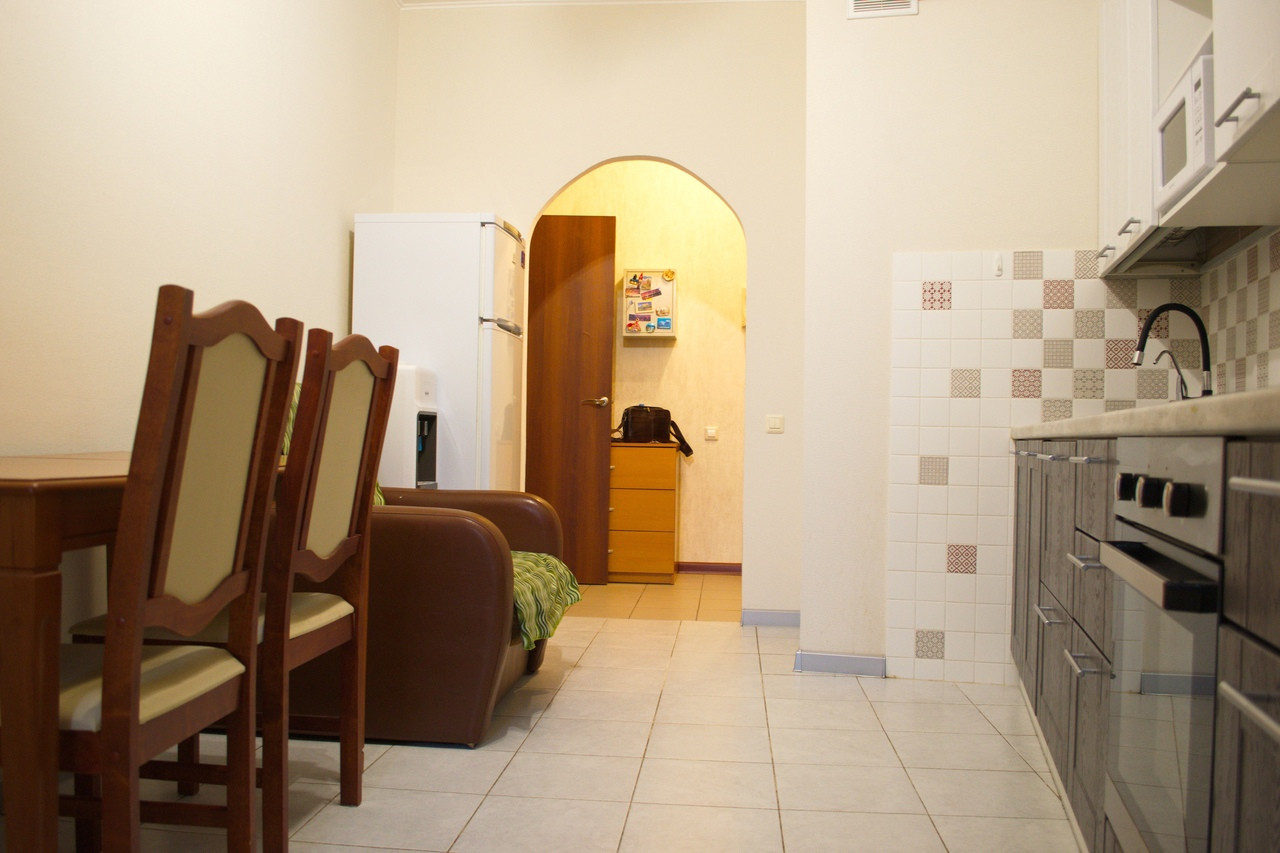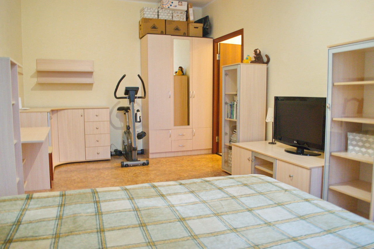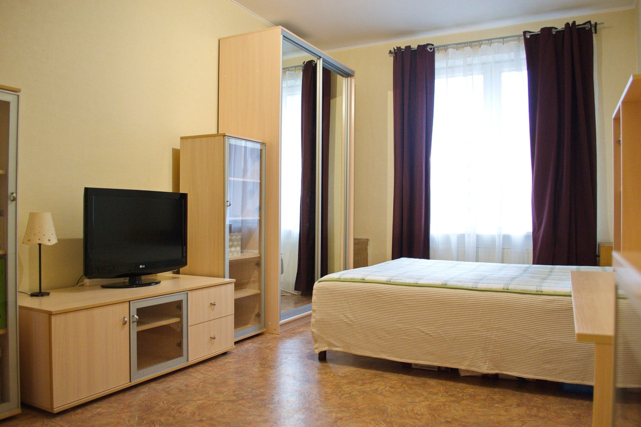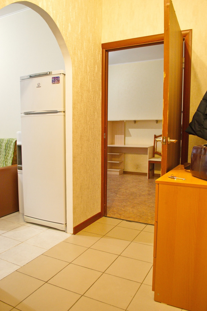 Просторная однокомнатная квартира с видом во двор. Кухня трапецивидной формы с балконом(на балконе отделка, а также блок кондиционера). Комната просторная, пол линолеум, стены обои. Санузел совмещенный в кафеле.