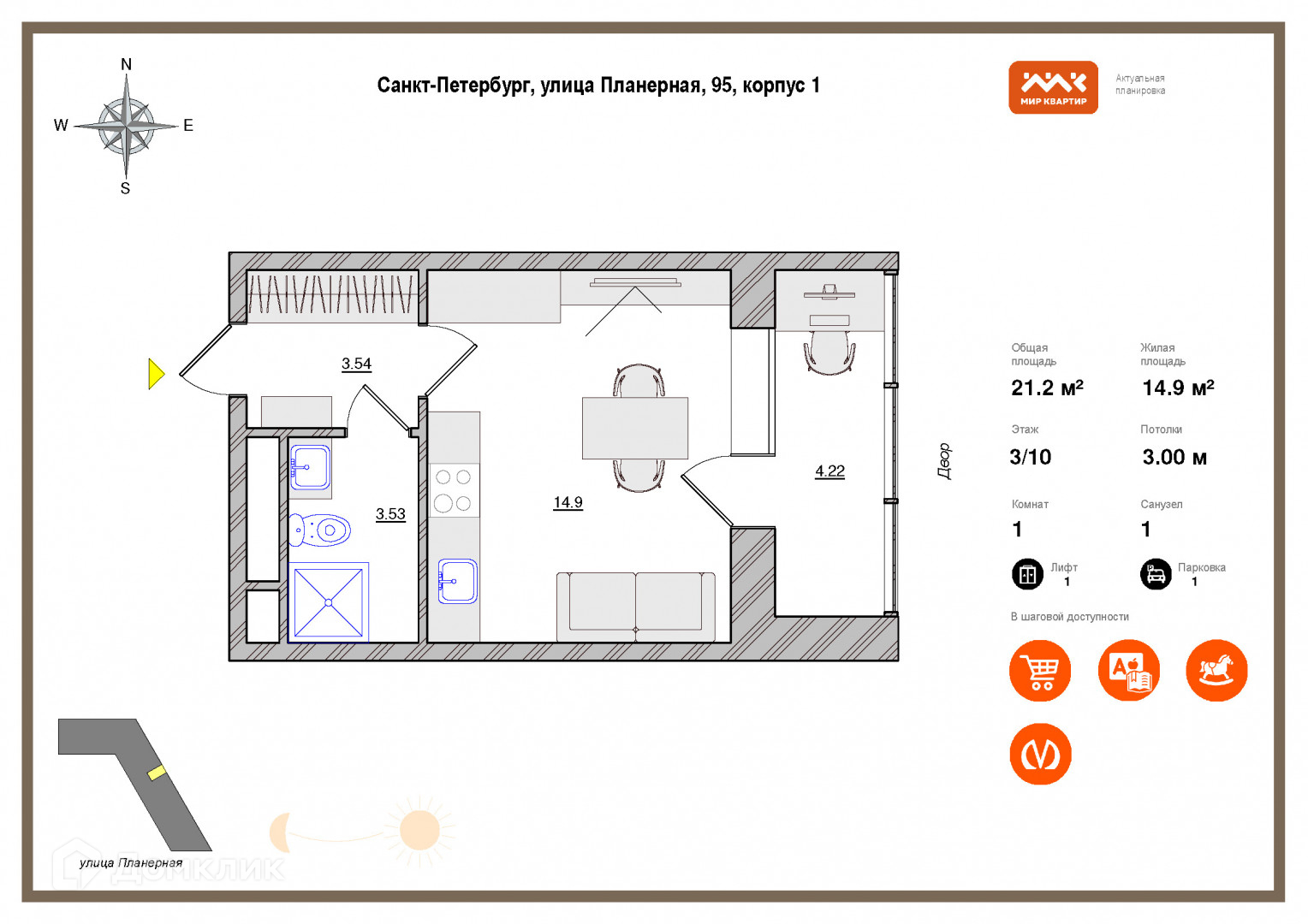 Квартира студия, 21.16 м2, этаж 3 / 10, на продажу в Санкт-Петербурге, Планерная улица, 97к2