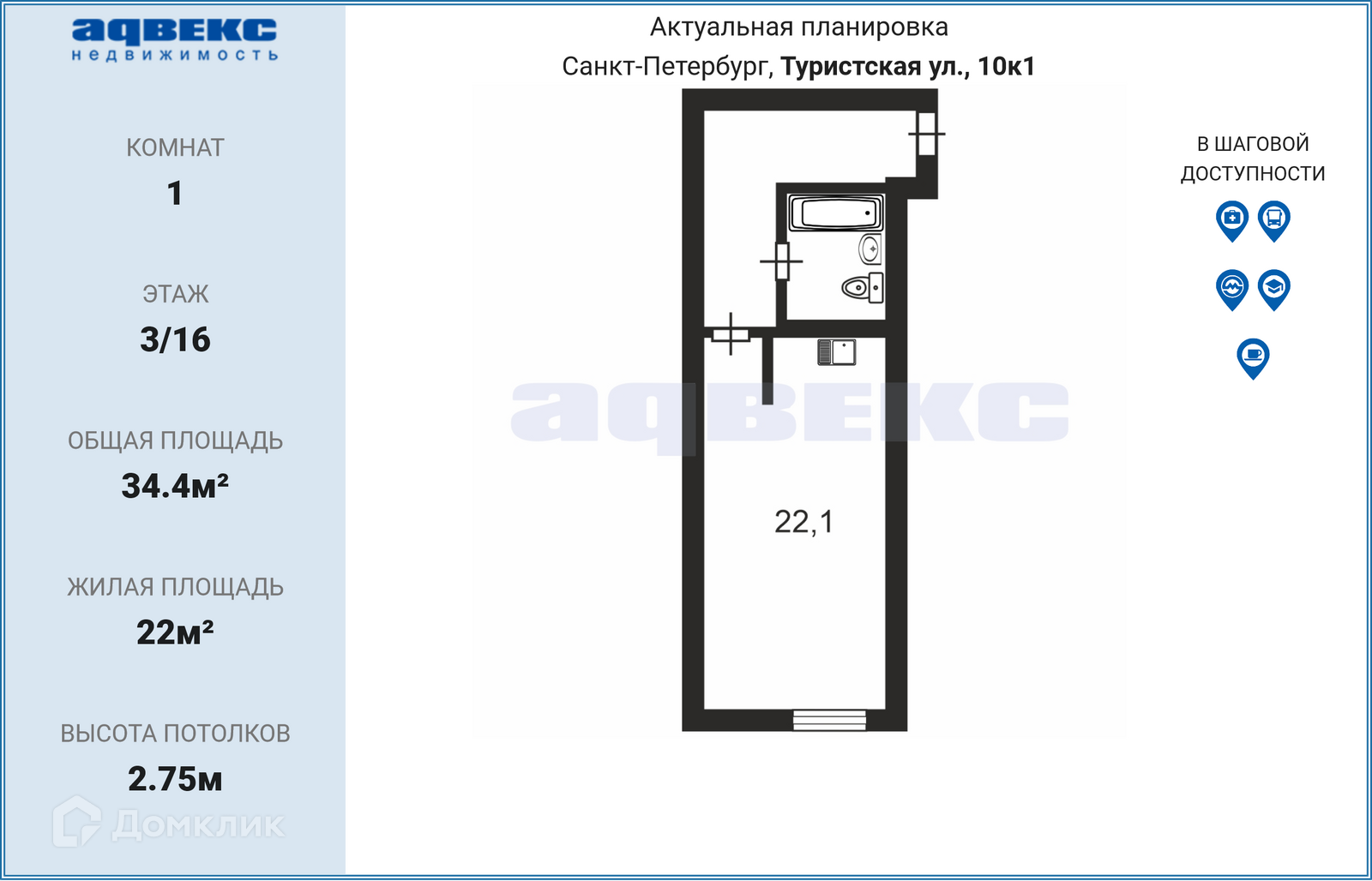 Квартира студия, 34.4 м2, этаж 3 / 16, на продажу в Санкт-Петербурге, Туристская улица, 10к1