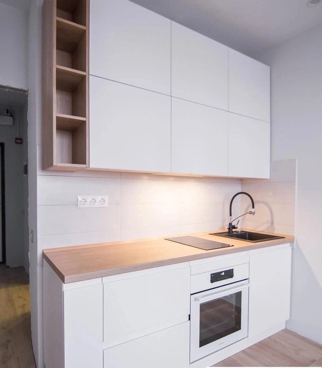 Удобное зонирование жилой площади на комнату и кухню.
