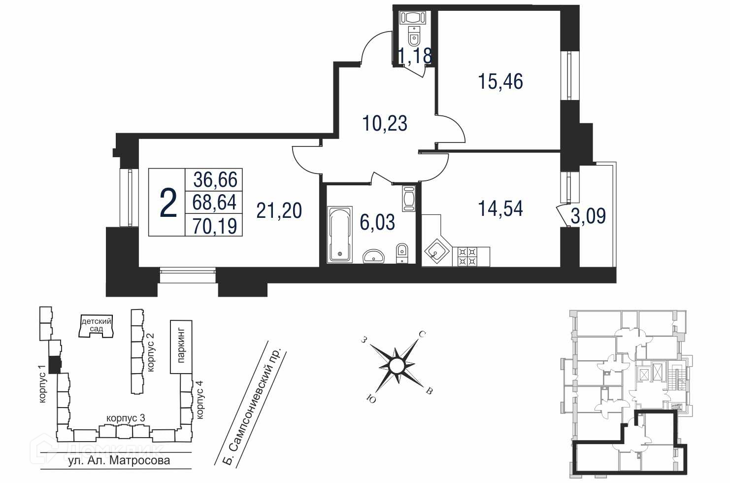 2-комнатная квартира, 69.55 м2, этаж 8 / 9, на продажу в Санкт-Петербурге, улица Александра Матросова, 8к1