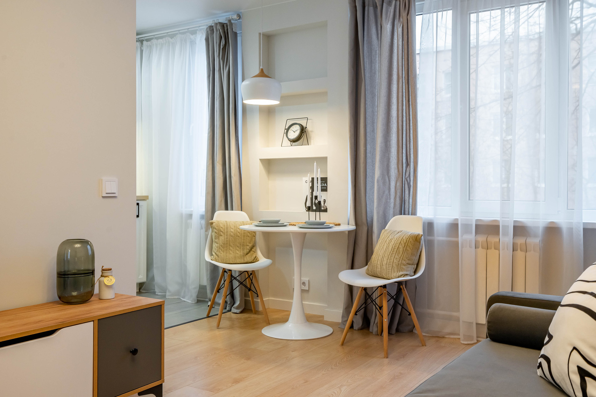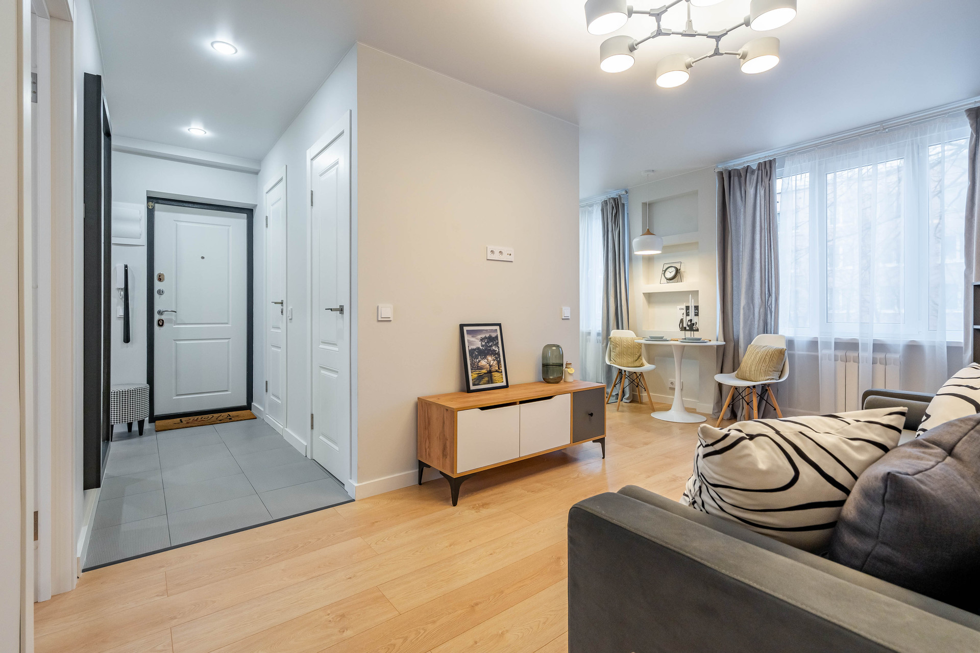 Квартира находится в тихом зеленом дворе в 3 минутах от метро Международная. Также совсем рядом располагается большой торговый центр, рестораны, салоны. Множество магазинов и супермаркетов. 2 детских сада прямо у дома, ещё 6 в пешей доступности. В радуисе 10 минут 3 школы и лицей. Пока делали ремонт познакомились со всеми соседями)) Все они вежливые, адекватные. Чистый подъезд.