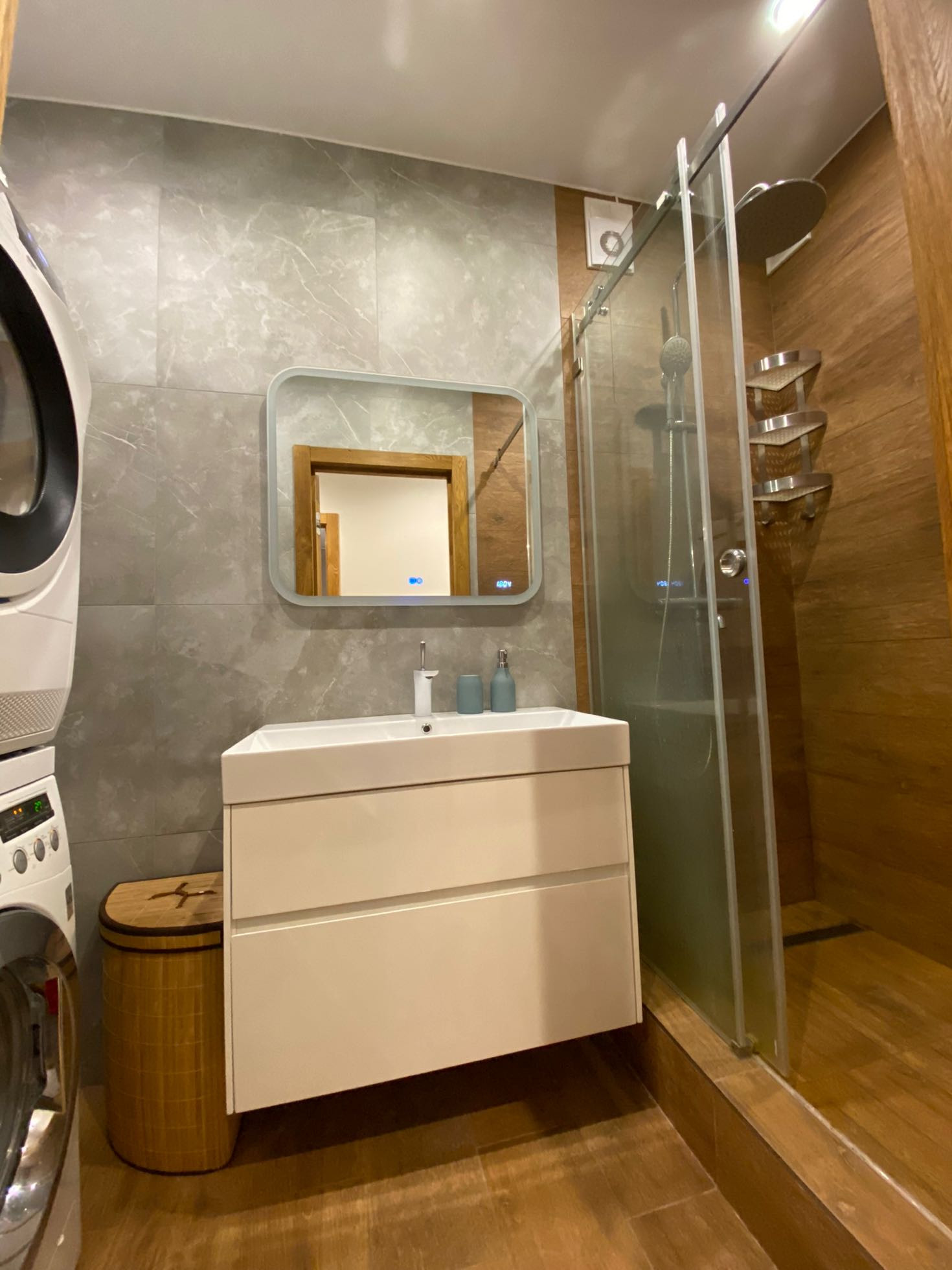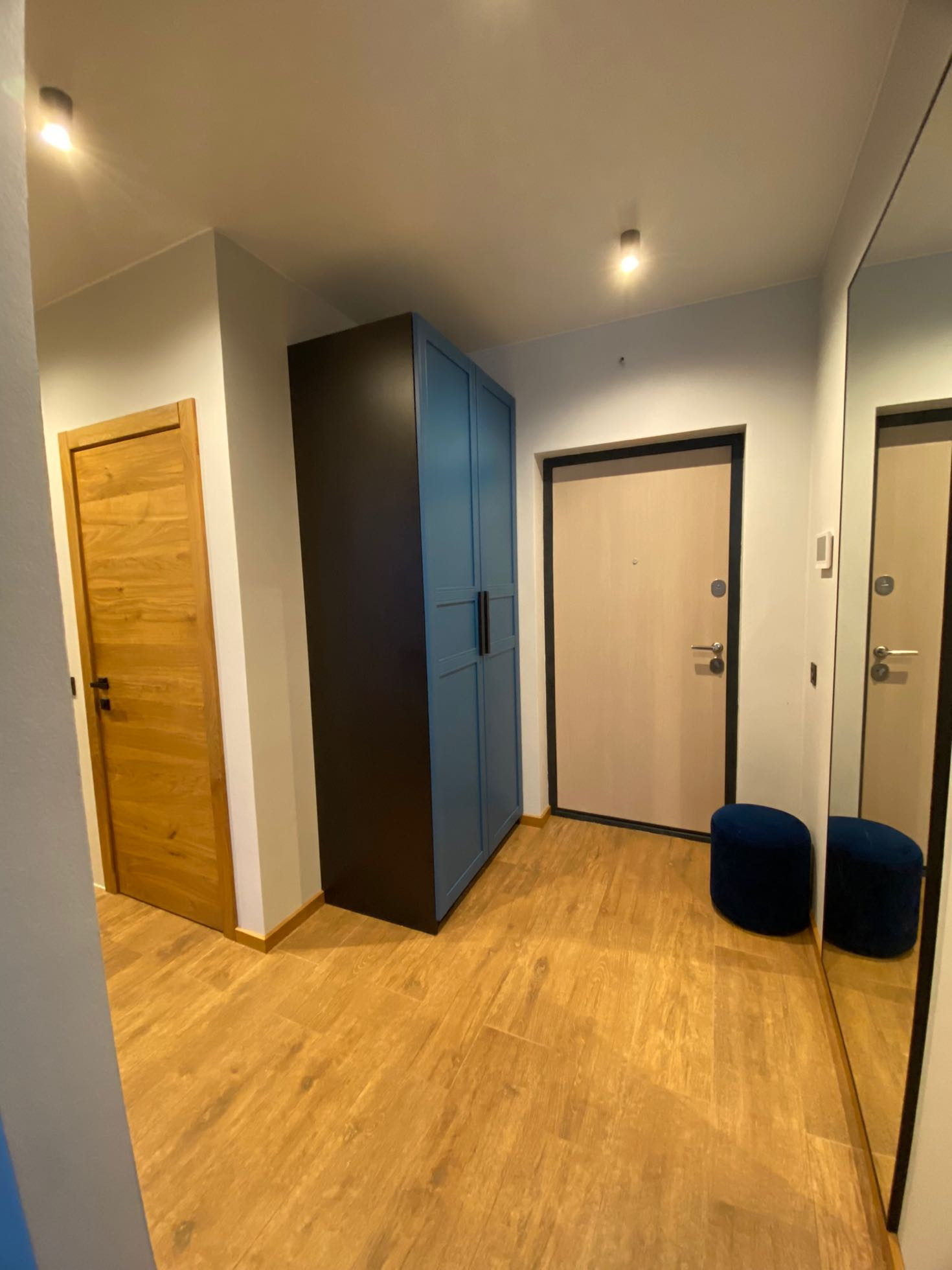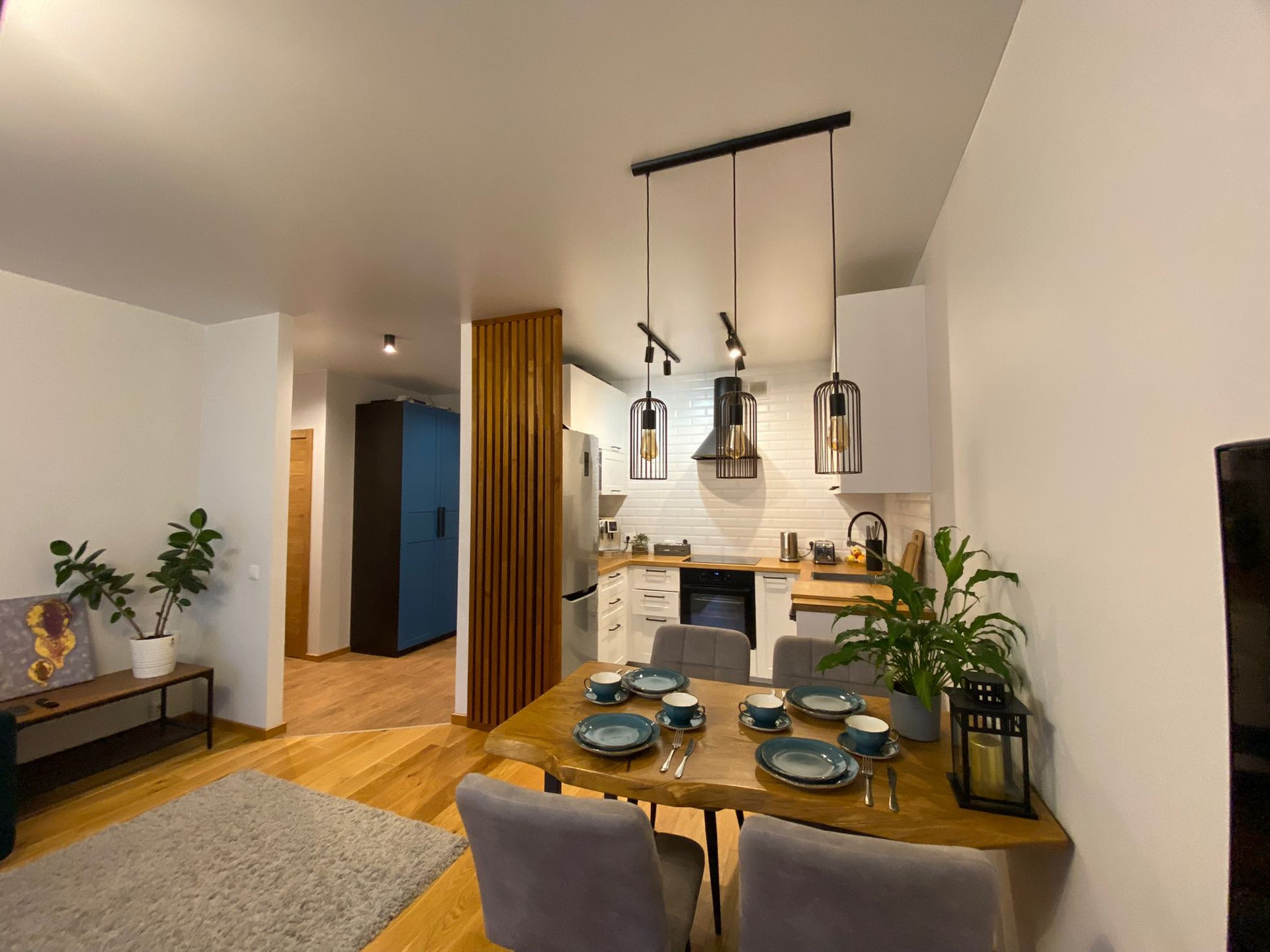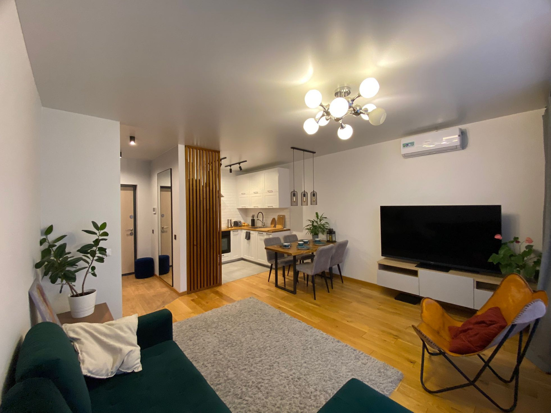Ремонт выполнен в умеренном скандинавском стиле с применение большого количества натуральных материалов и дерева.