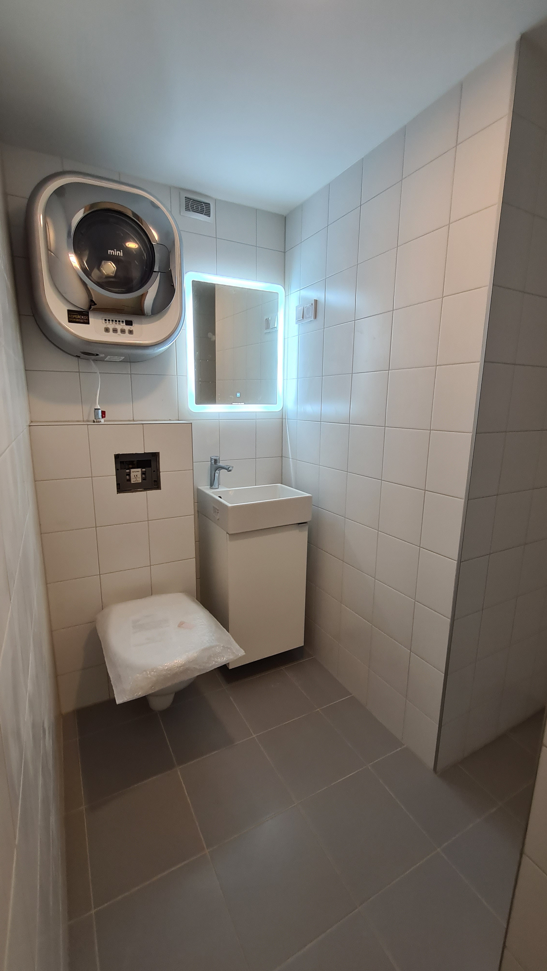 В квартире сделан сан узел под ключ (инсталляция, стиральная машина, тропический и обычный душ, зеркало с подсветкой и раковина с тумбочкой).