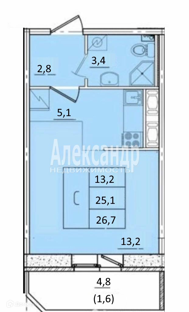 Общая площадь без учета площади балкона - 25,1 кв.м,