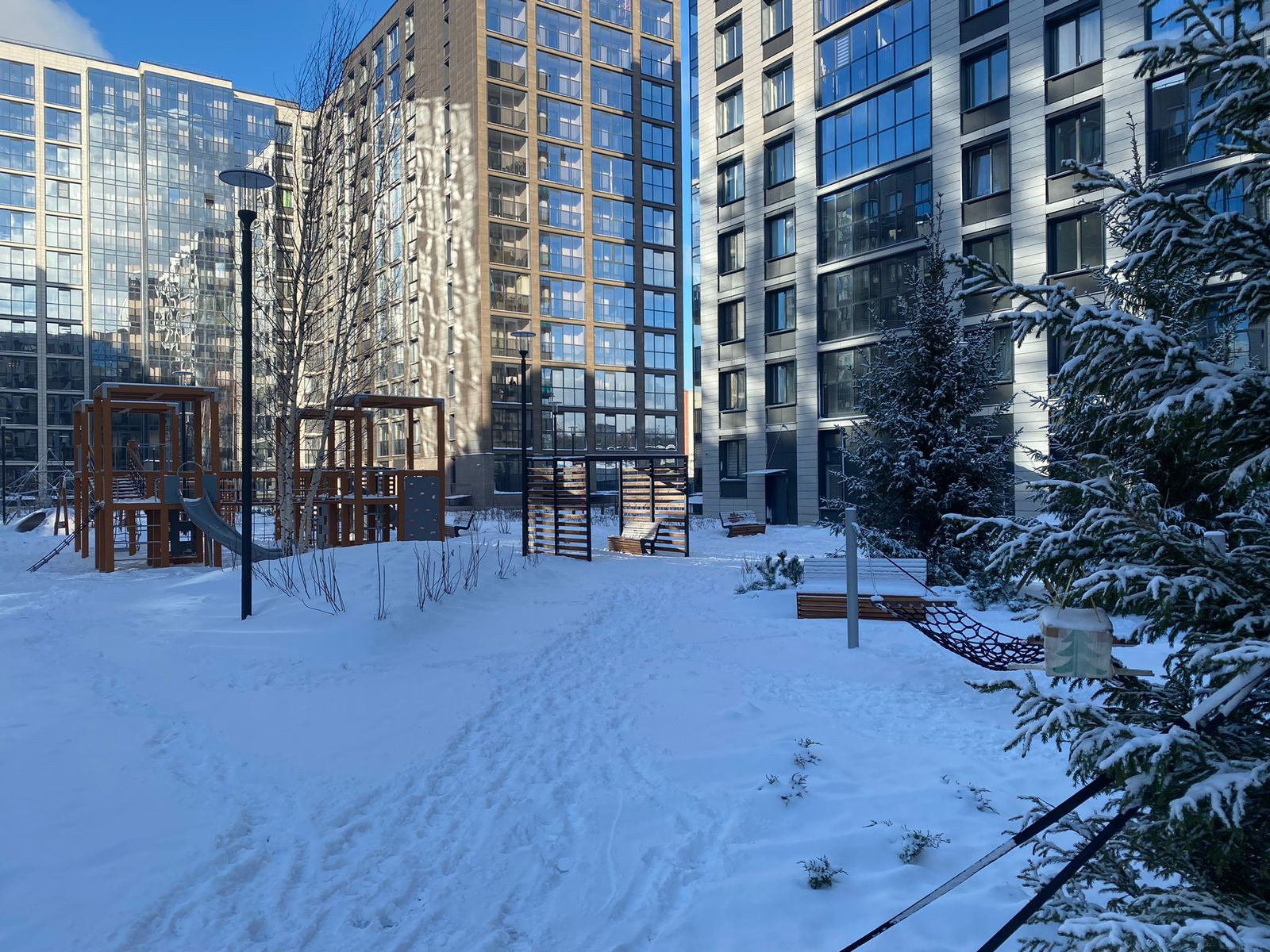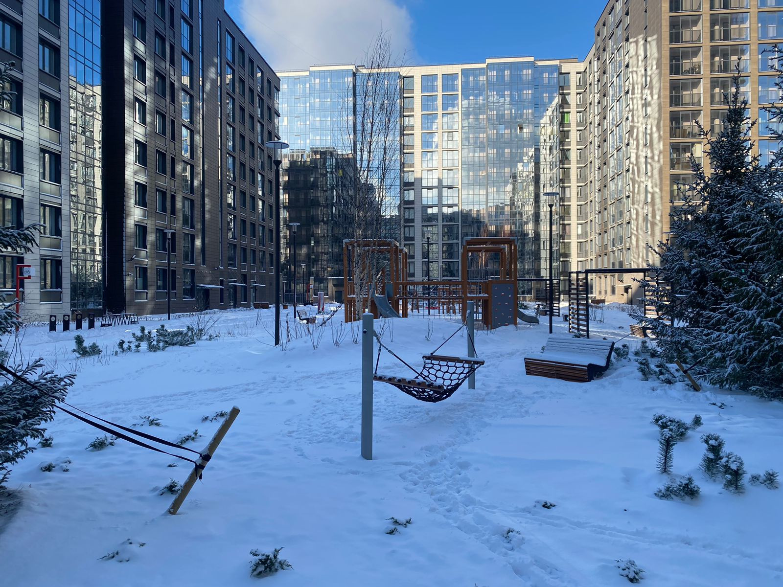 Комплекс расположен между двух парков - Сосновка и Удельный (10 минут пешком до каждого). Так же рядом находится станция метро «Удельная» (20 минут пешком). В самом комплексе закрытая охраняемая территория, двор без машин, современные детские площадки для разных возрастных групп. В домах установлена система «Дом-онлайн» для автоматического учета показаний счетчиков. Для автовладельцев предусмотрен подземный паркинг. Так же в состав комплекса входят три детских сада и школа.