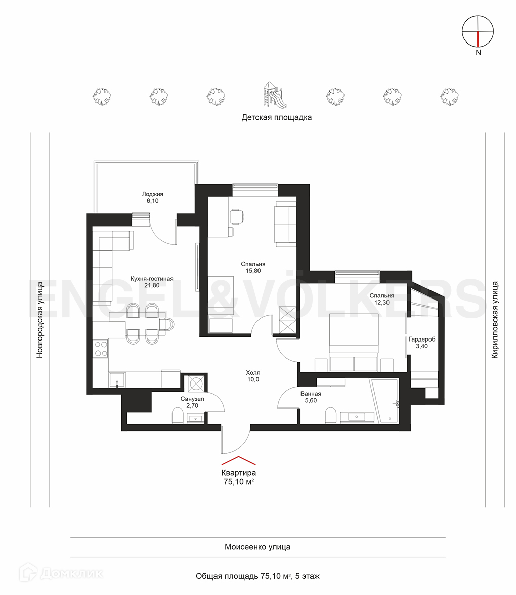 2-комнатная квартира, 75 м2, этаж 5 / 8, на продажу в Санкт-Петербурге, улица Моисеенко, 27