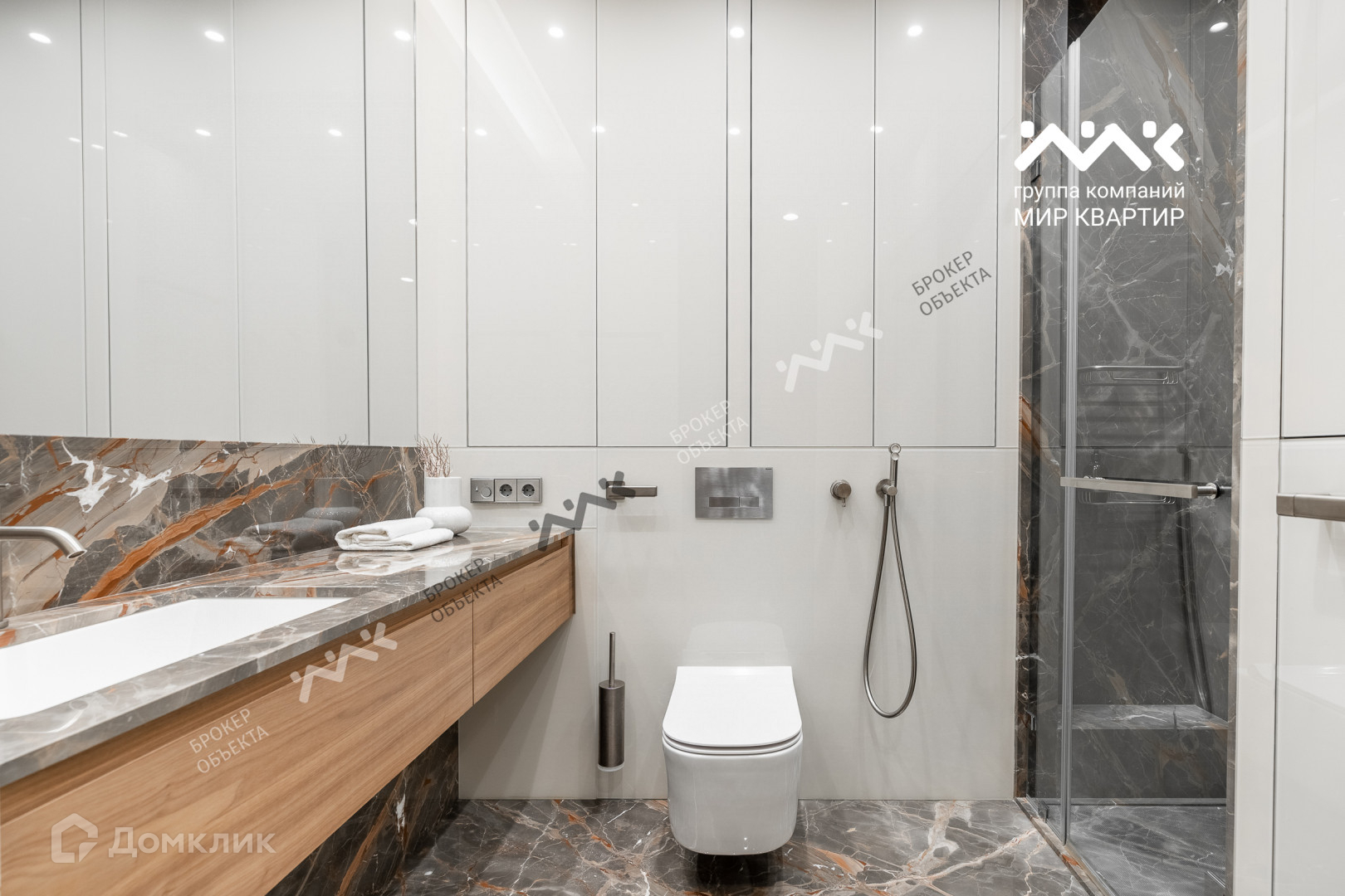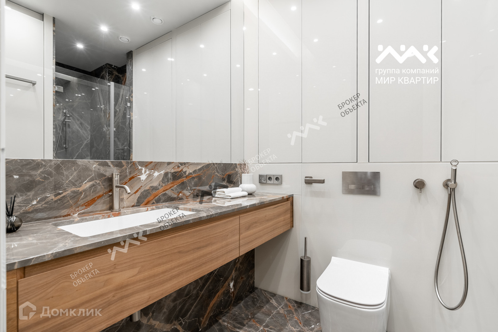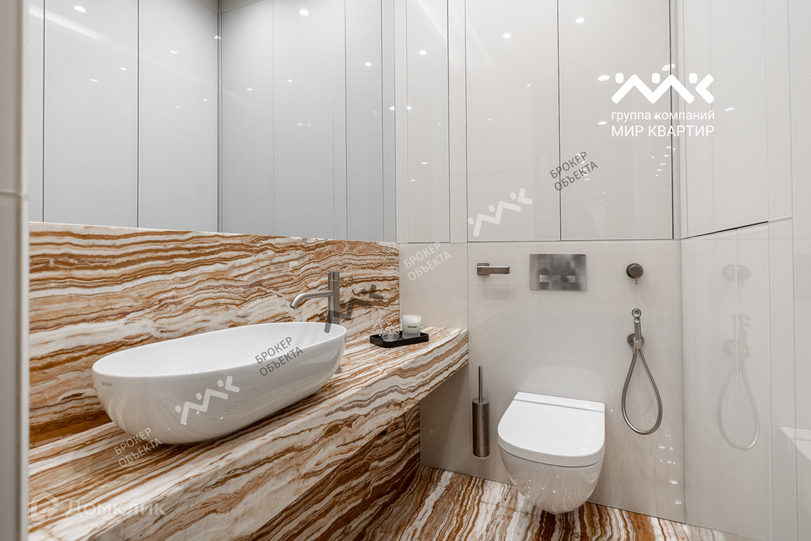 Санузлы: Мрамор «Караваджо» и оникс «Тигран», обратнокрашенное стекло, широкоформатные зеркала