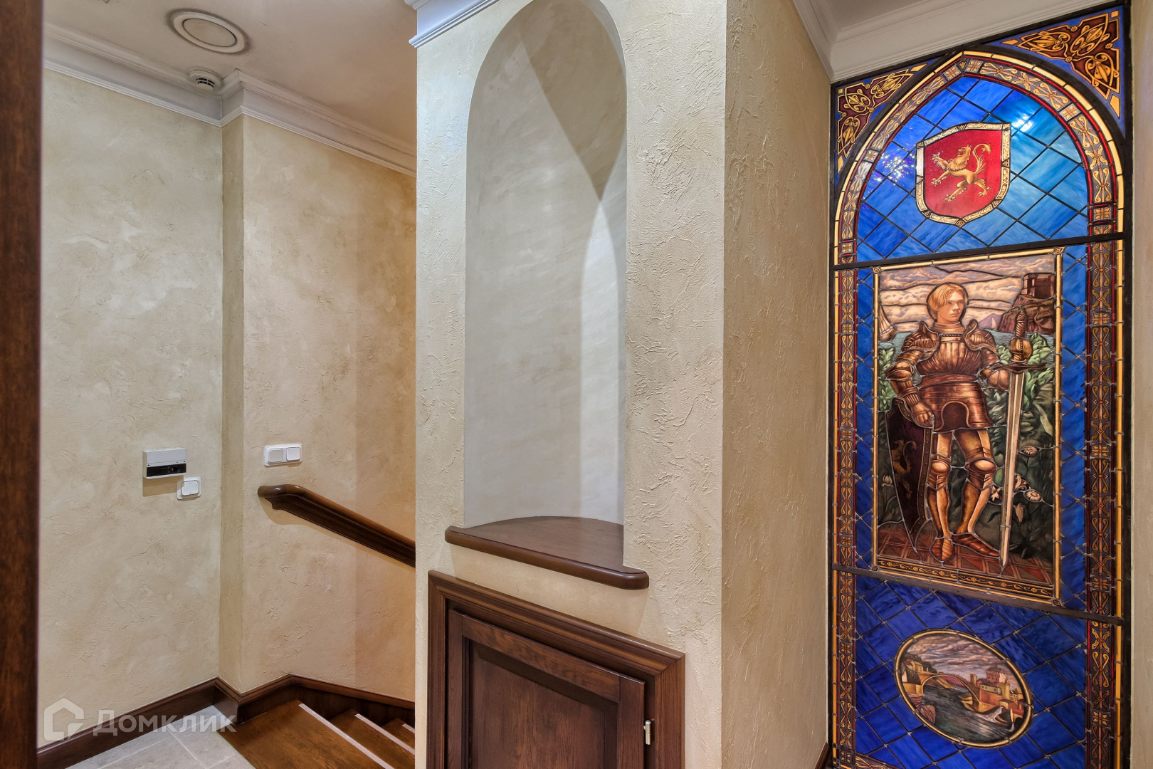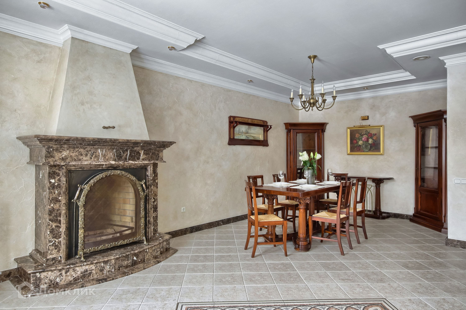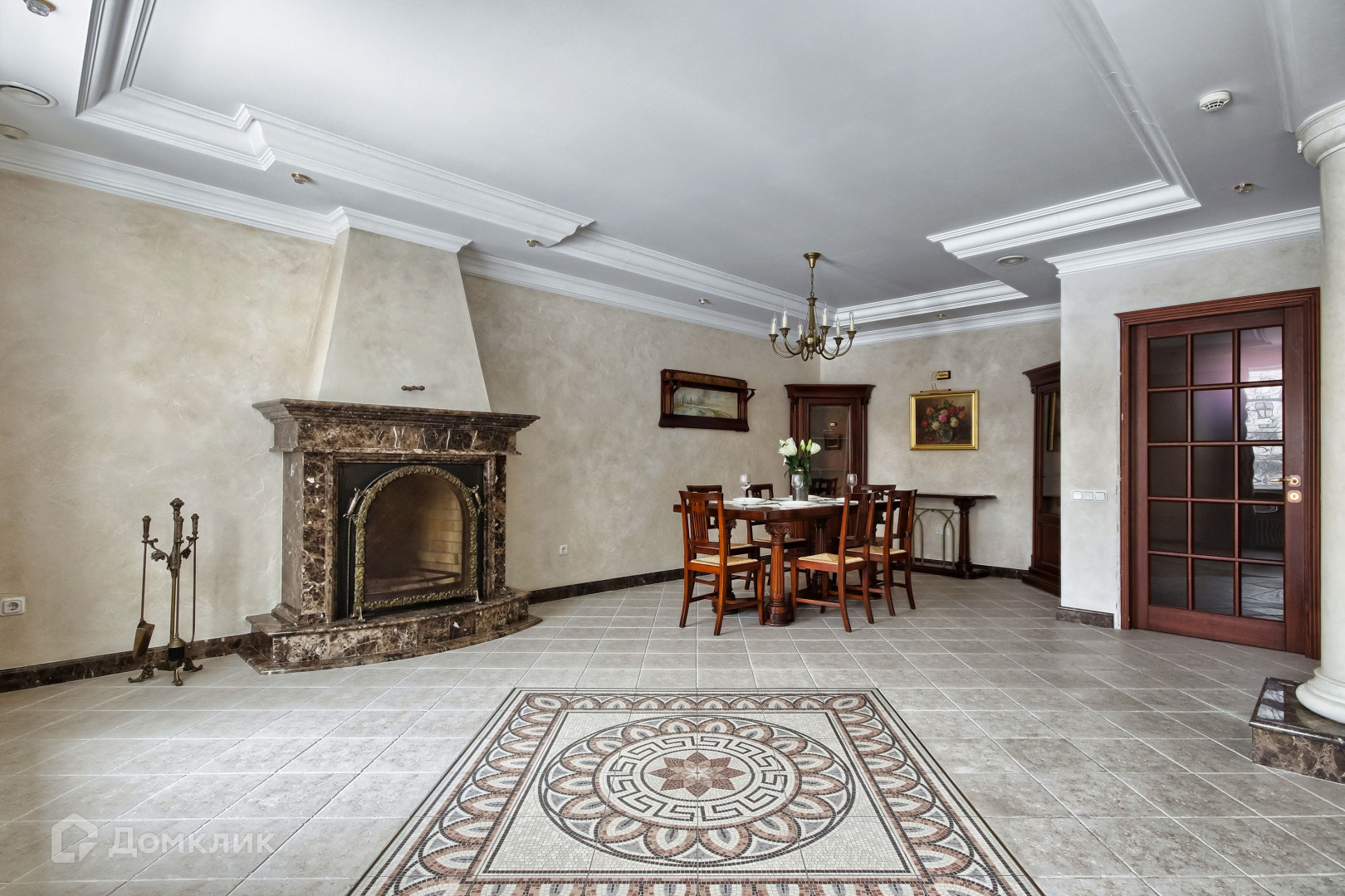 Камины и многие элементы интерьера выполнены из натурального мрамора, в отделке также использовалось натуральное дерево. Витражи и фрески от известного художника Эрмитажа.