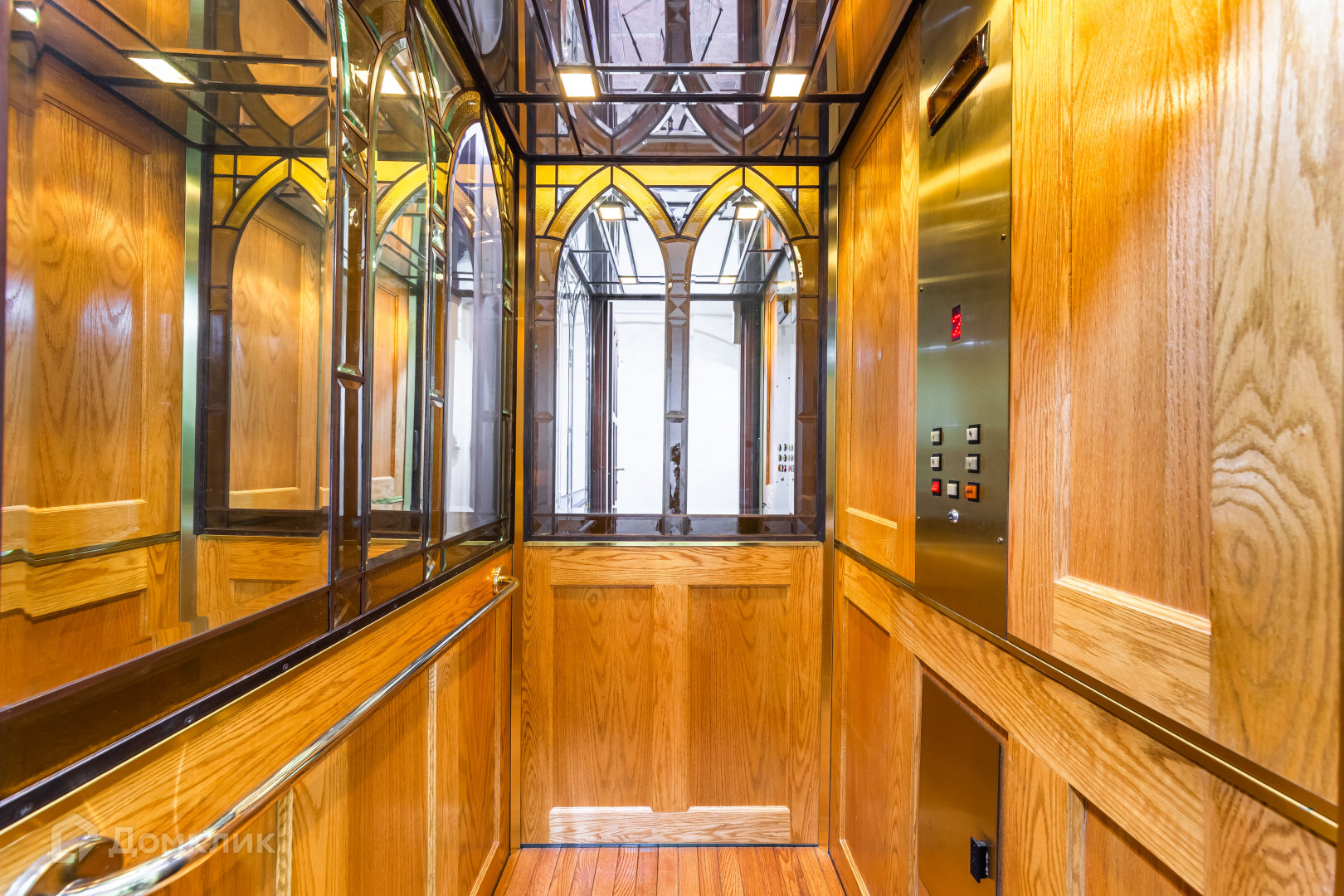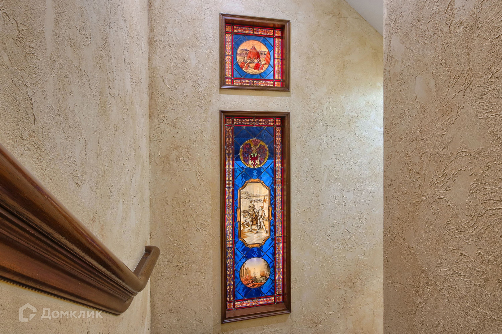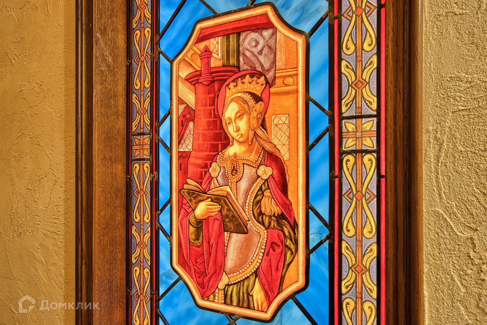 Камины и многие элементы интерьера выполнены из натурального мрамора, в отделке также использовалось натуральное дерево. Витражи и фрески от известного художника Эрмитажа.