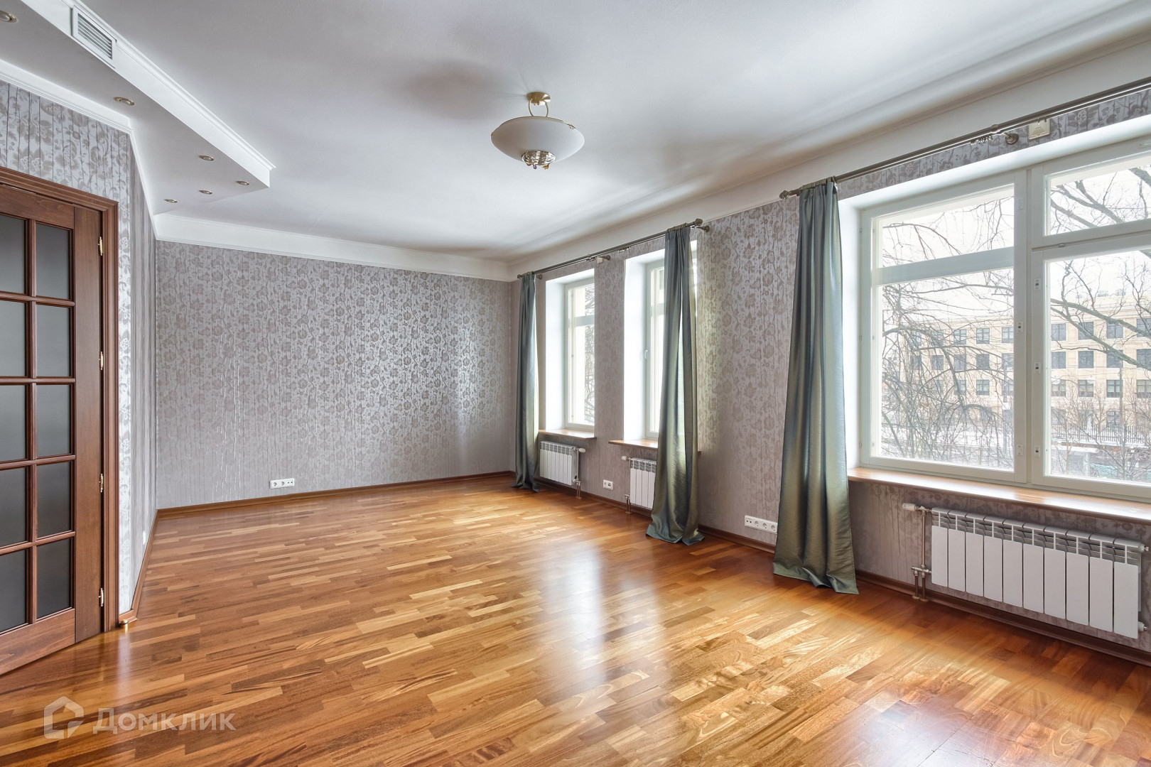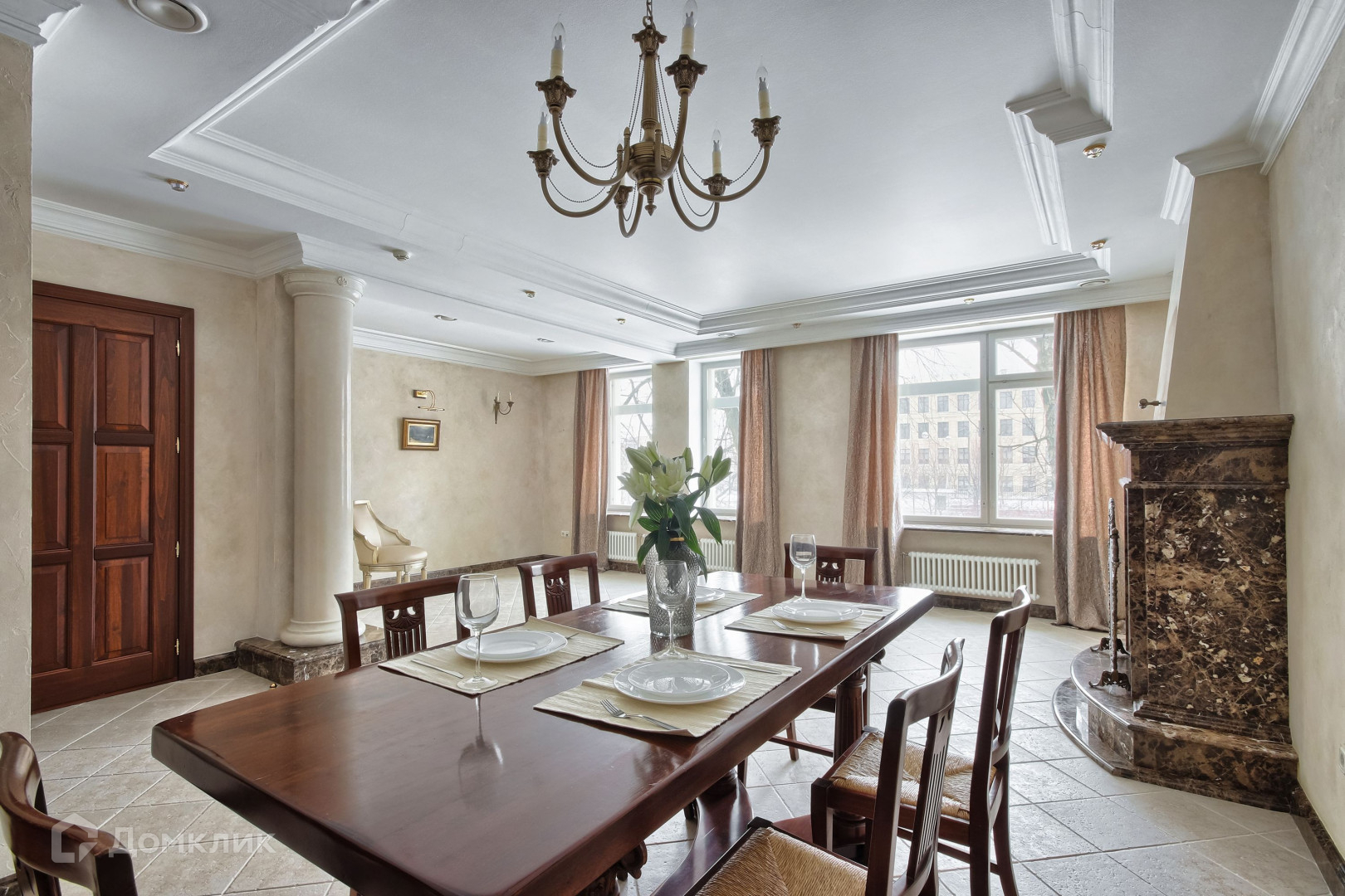 большая гостиная с камином 40 кв.м. , три окна на сквер